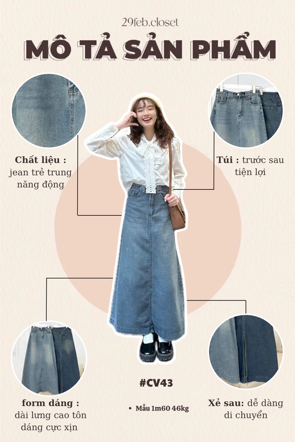 - Đặc điểm: chân váy jean bò dáng suông dài lưng cao cách điệu tua rua dưới gấu váy thời trang Hàn Quốc, dễ phối đồ, có thể mang nhiều dịp khác nhau