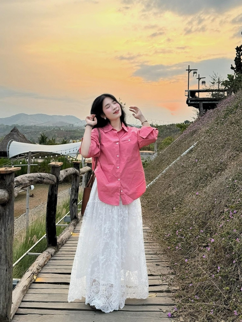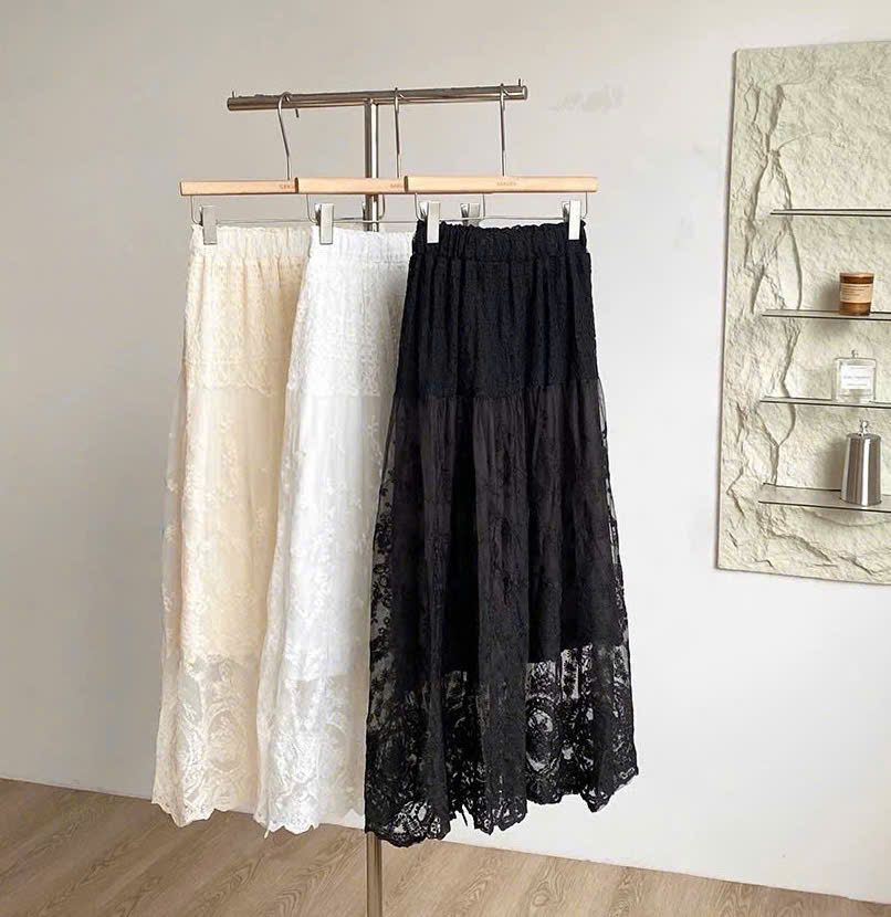 Chân váy midi ren ALISA dáng dài vải 2 lớp eo cao chun co giãn dịu dàng nhẹ nhàng Hàn Quốc
