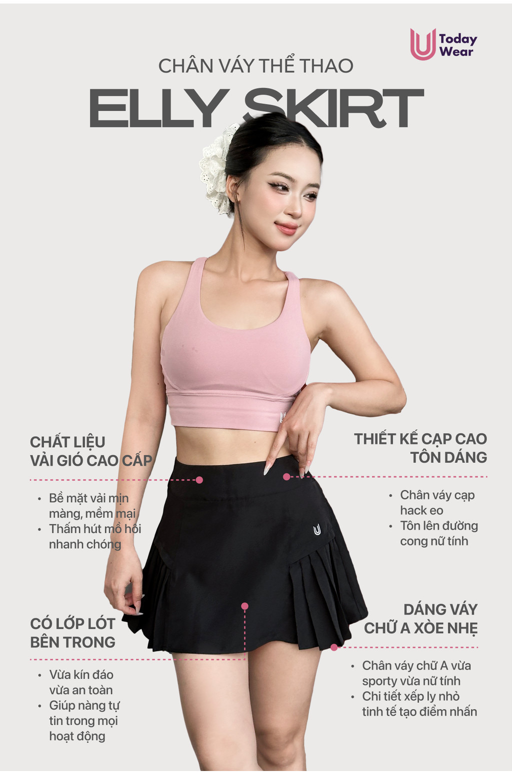 - Thiết kế: Dành cho các cô gái theo đuổi style năng động sporty nhưng không kém phần nữ tính, Elly Skirt với thiết kế cạp cao tôn eo, dáng váy chữ A xòe nhẹ cùng chi tiết xếp ly nhỏ tinh tế. Thiết kế khóa kéo phía sau linh hoạt giúp nàng tự tin di chuyển trong mọi hoạt động, dù là dạo phố hay chơi thể thao (cầu lông, tennis, chạy bộ, pickleball...)