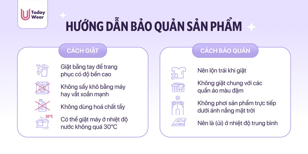 - Nên lộn trái, giặt bằng tay để trang phục có độ bền cao. Có thể giặt máy ở nhiệt độ nước không quá 30 độ