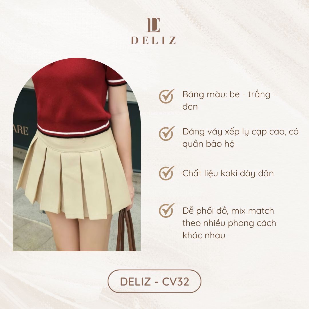 Chân váy xếp ly ngắn form xòe chất kaki hàn cạp cao tôn dáng xếp li to basic thiết kế CV32 DELIZ