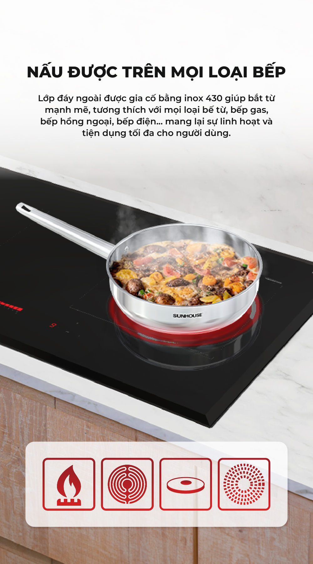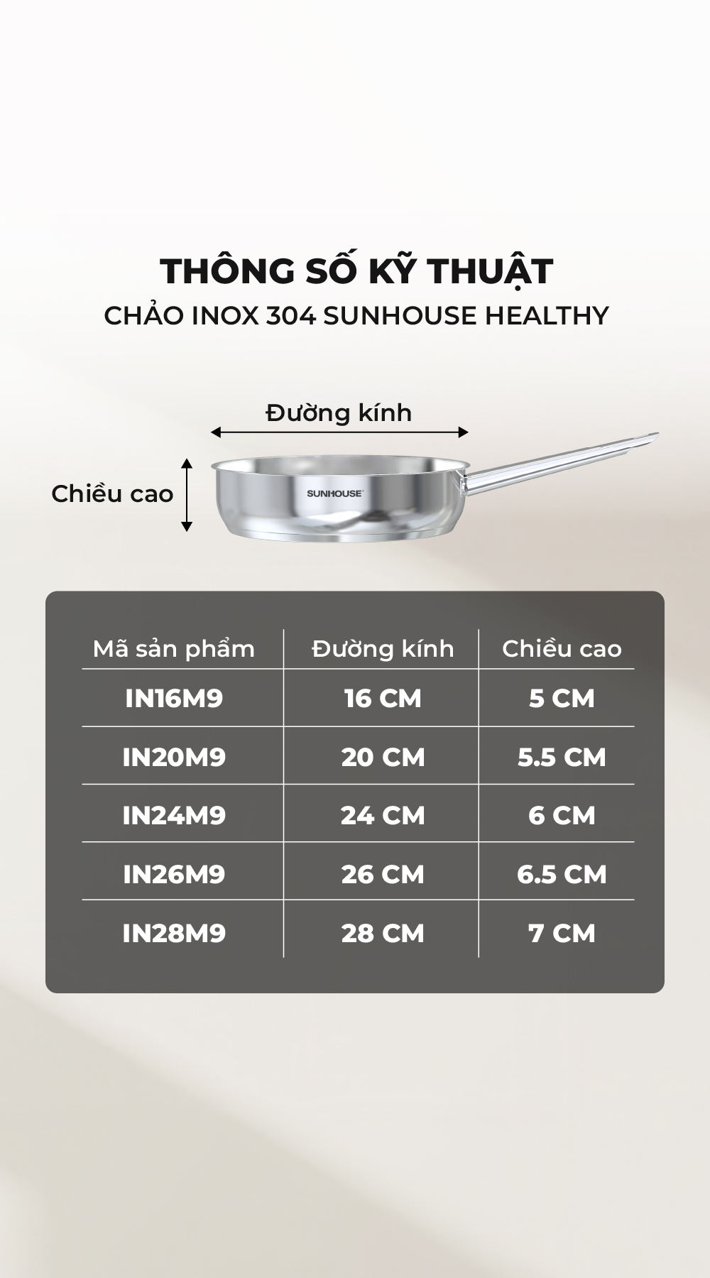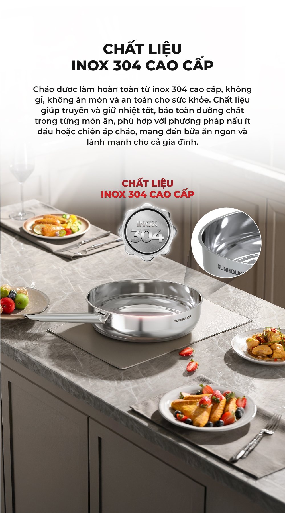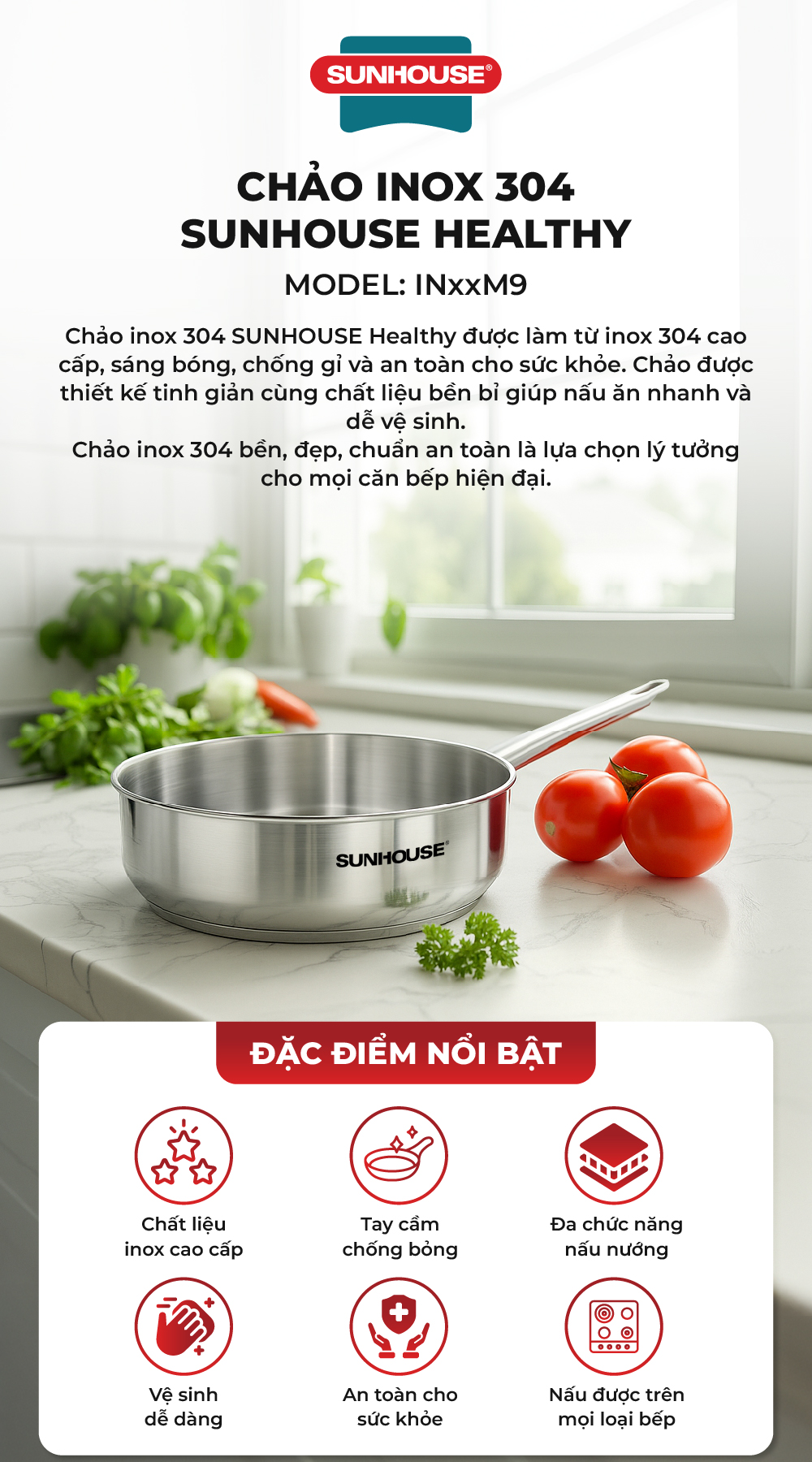 Chảo Inox 304 cao cấp Sunhouse Healthy IN16-20-24-26-28M9 - Phù hợp mọi loại bếp - Tay cầm Inox không gỉ