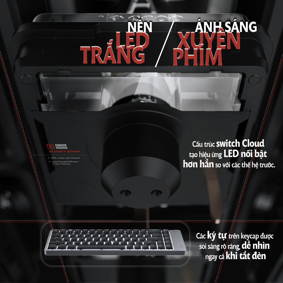 → Mỗi switch Cloud Series trên Flow 2 được thiết kế khoang LED lớn hơn, ánh sáng thoát ra đồng đều và mạnh mẽ gấp 3,2 lần bản Flow cũ.