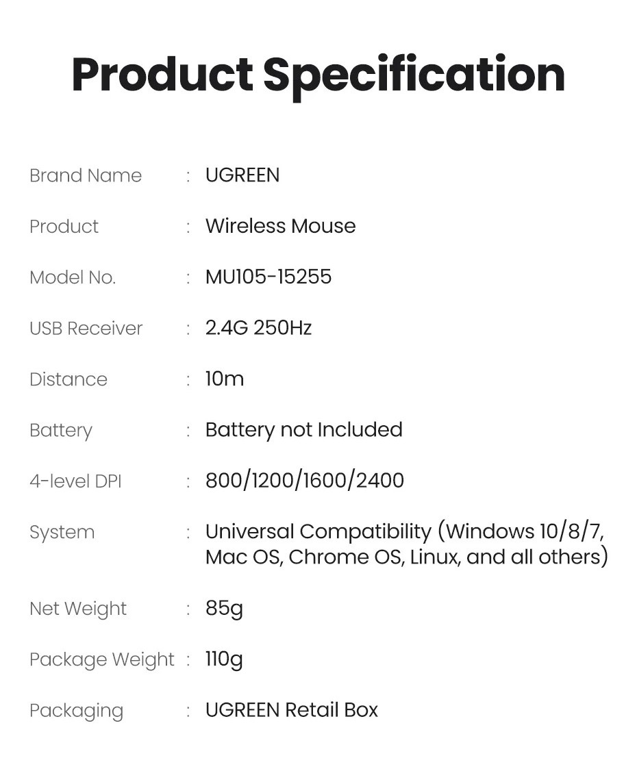Chuột không dây 2.4G UGREEN MU105 | 4 mức điều chỉnh DPI | Độ yên tĩnh cao | Bảo Hành 18 Tháng 1 Đổi 1