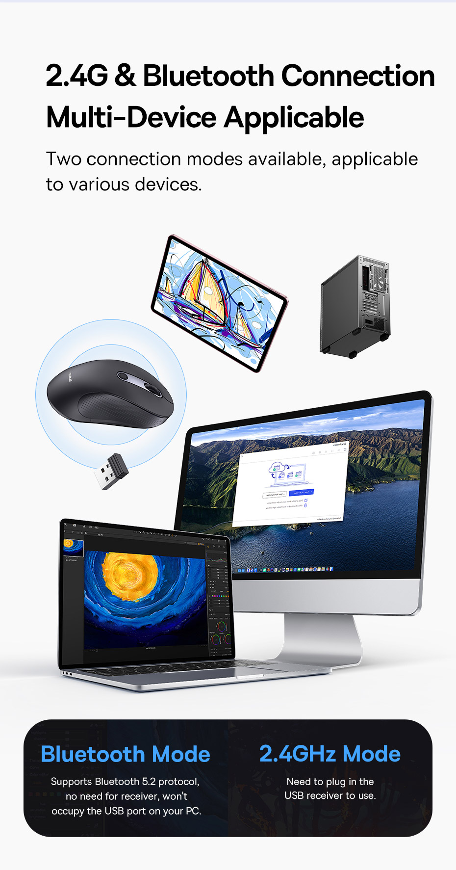 - Kết nối 2.4G & Bluetooth 5.2 phù hợp cho PC, laptop và máy tính bảng.
