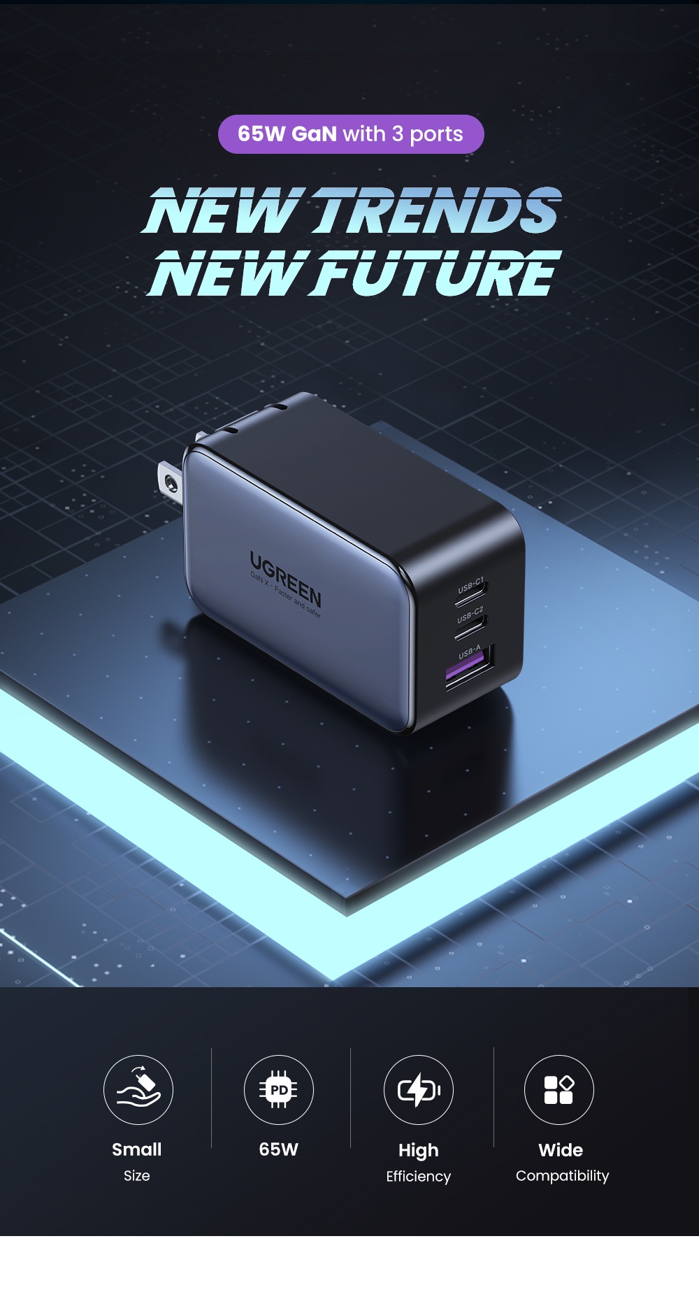 Đầu ra ba cổng 3 ' '2C1A. công suất tối đa của một cổng duy nhất là 65W , có thể đáp ứng nhu cầu sạc của nhiều thiết bị '