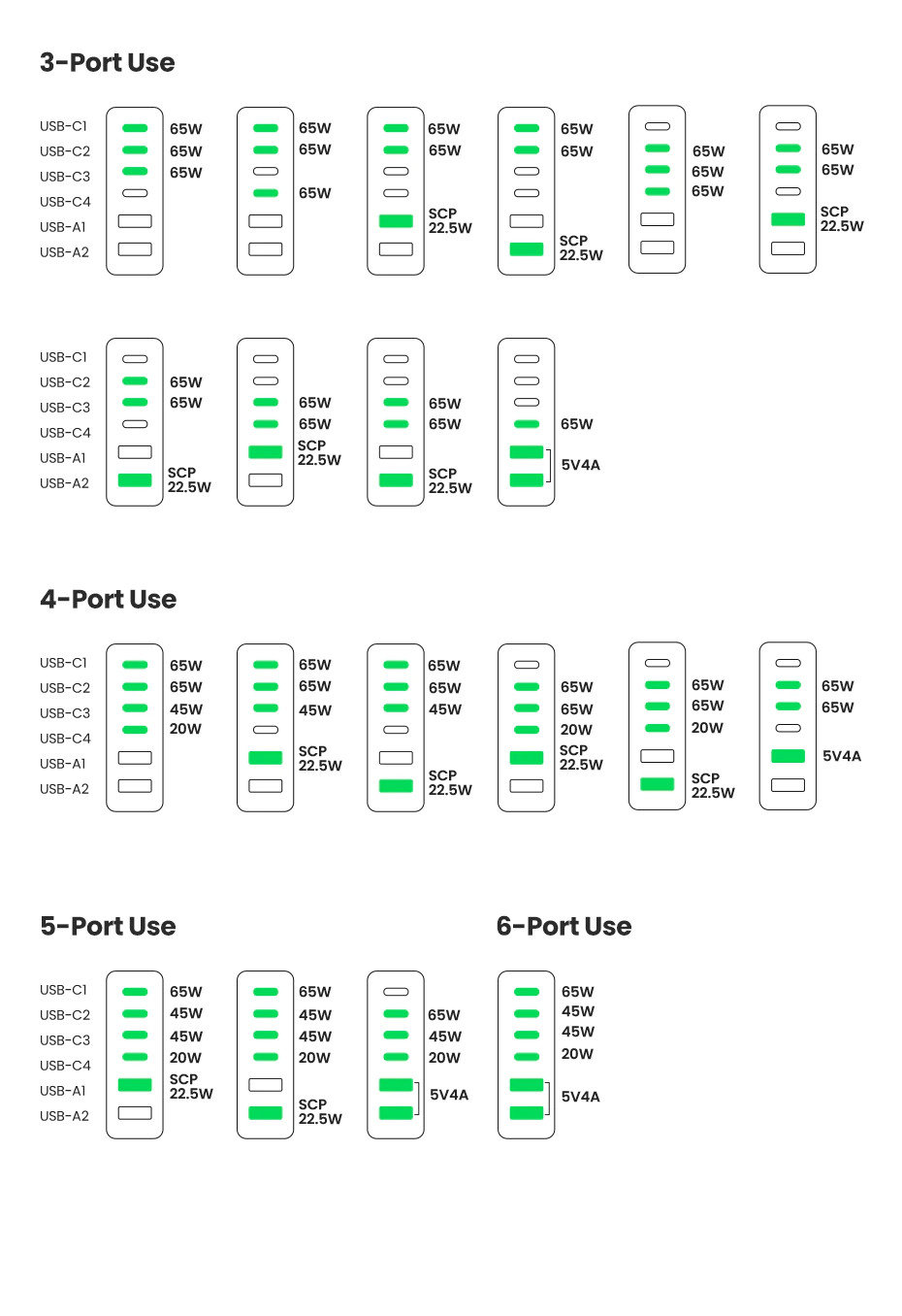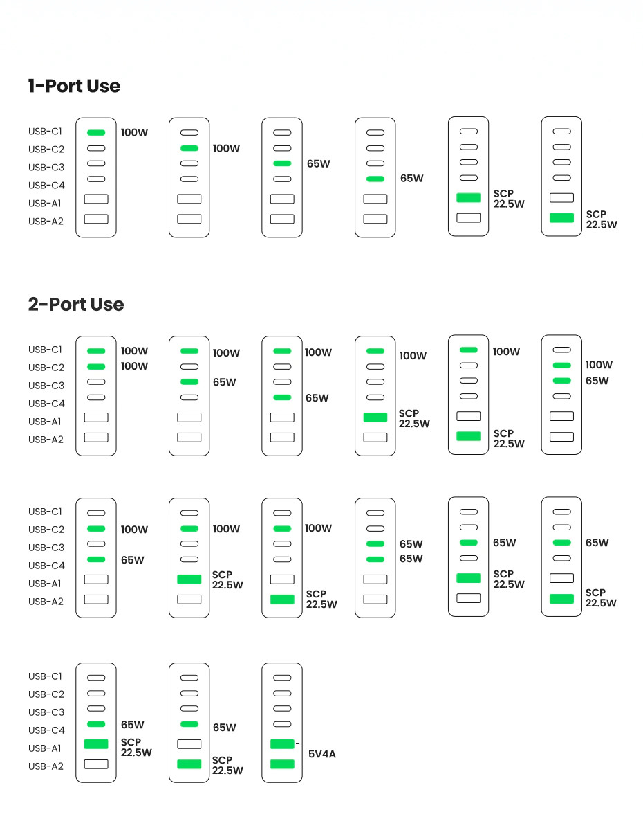 + USB-A1/A2: 22.5W Max (QC 3.0, SCP, FCP, AFC)