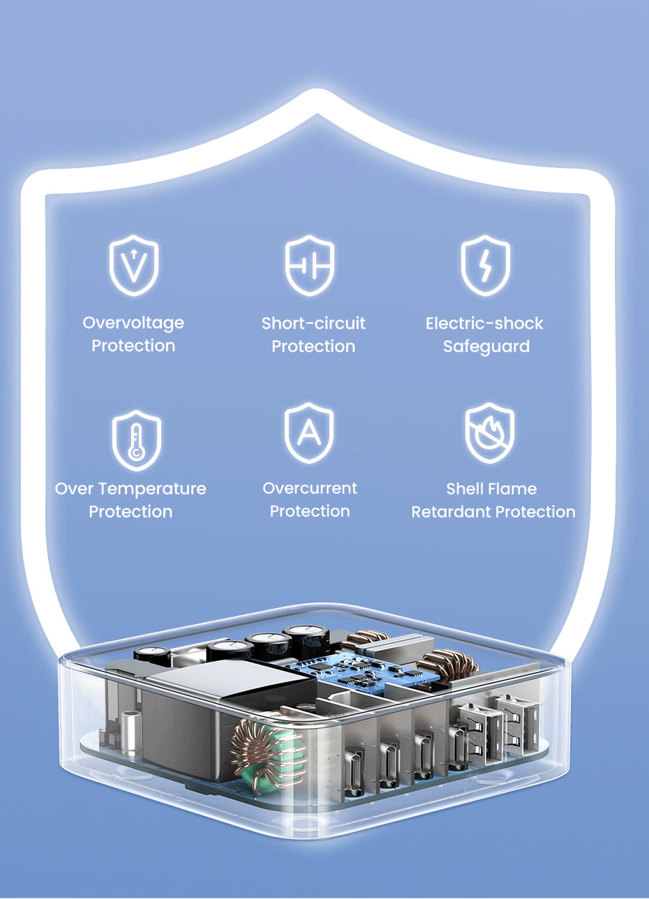 - 6 cổng sạc tiện lợi: 4 USB-C và 2 USB-A, sạc cùng lúc nhiều thiết bị.