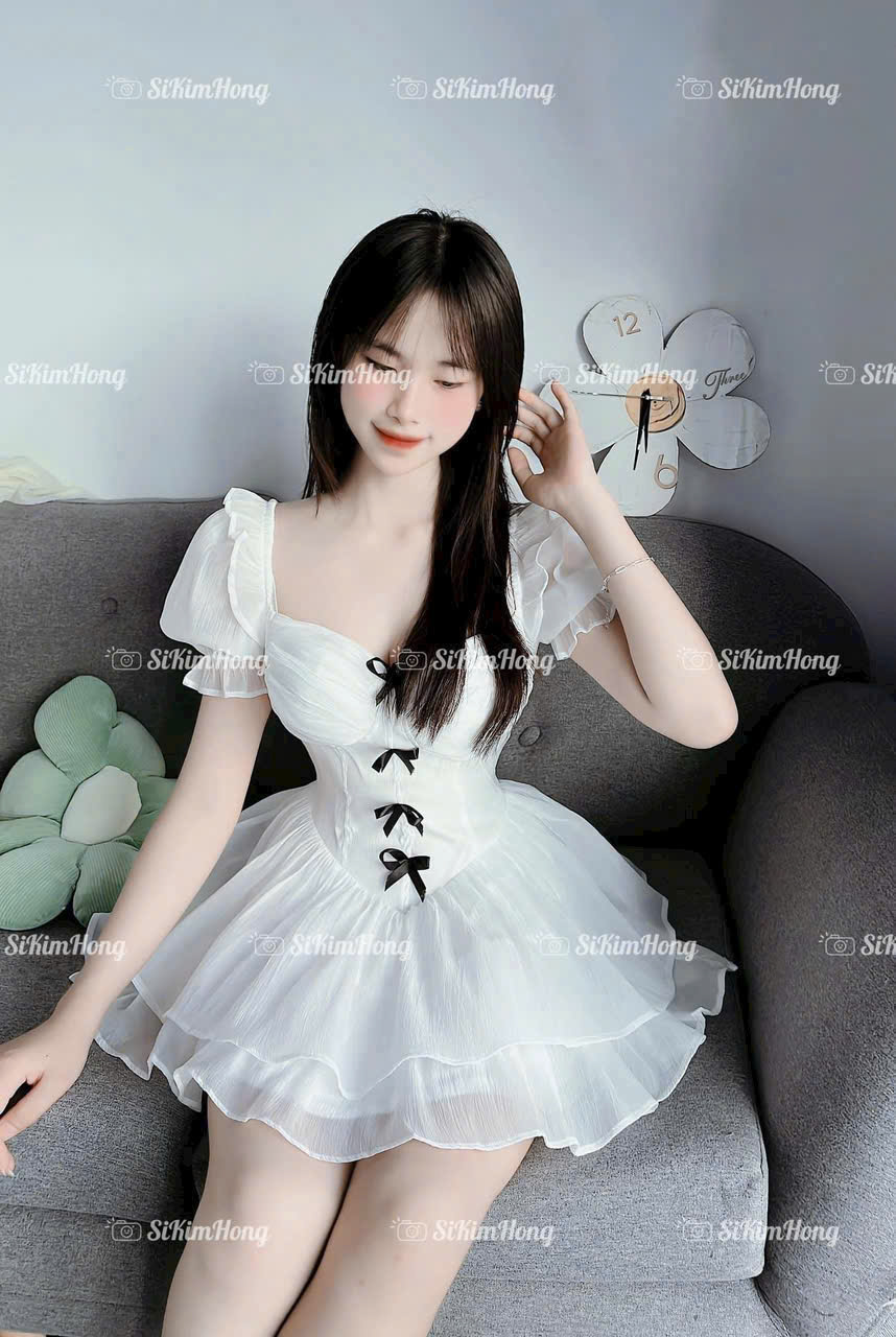 Đầm tiểu thư chất tơ nến tay ngắn cổ vuông đính nơ xinh váy ngắn xòe thiết kế trẻ trung thích hợp mặc đi chơi