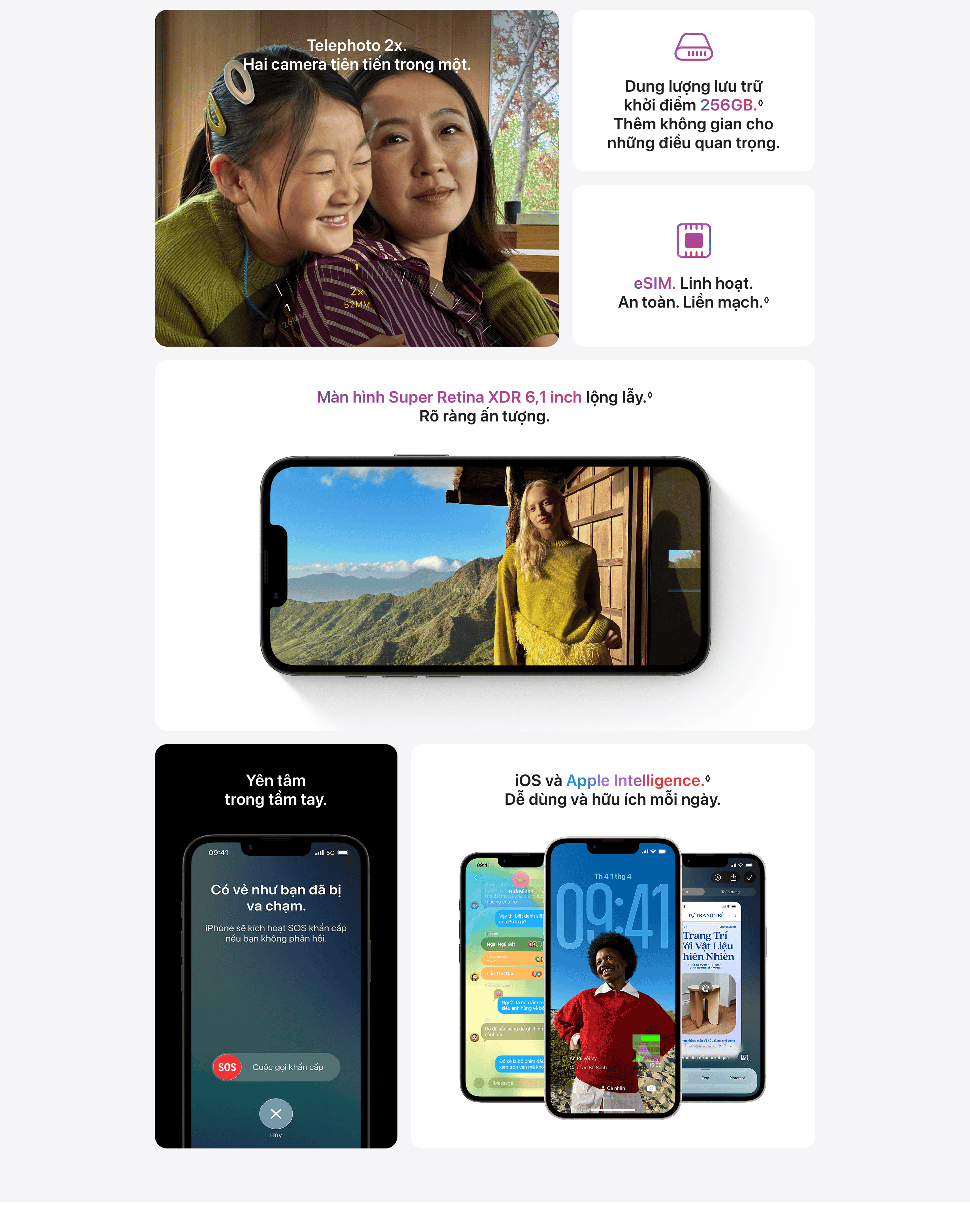 · iOS VÀ APPLE INTELLIGENCE. DỄ DÙNG VÀ HỮU ÍCH MỖI NGÀY.6 – Riêng tư, bảo mật, mạnh mẽ. Viết lách, thể hiện bản thân và hoàn thành công việc dễ dàng với các tính năng tiên tiến như Sàng Lọc Cuộc Gọi, Dọn Dẹp, Dịch Trực Tiếp và trí thông minh thị giác.3
