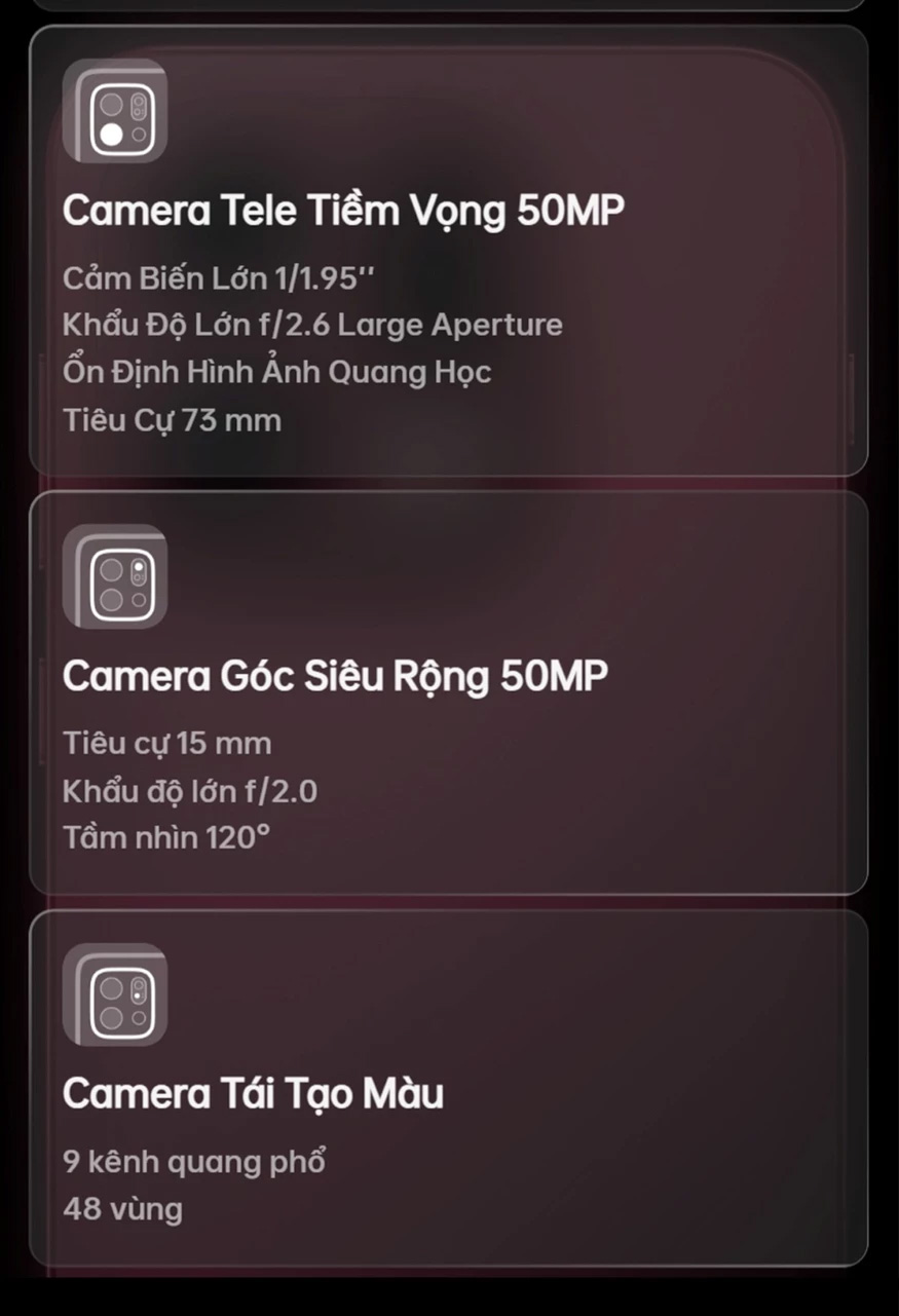 Độ phân giải 50MP OIS (Chính) + 50MP OIS (Tele) + 50MP (Góc rộng) + 2MP (Mono)