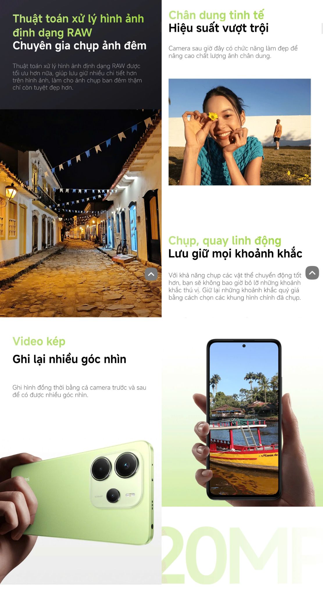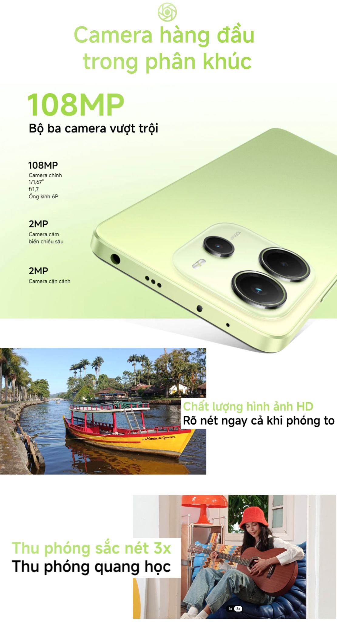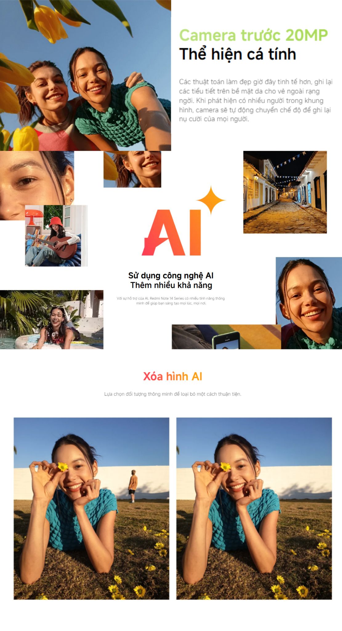 Redmi Note 14 sở hữu camera AI 108MP kết hợp với zoom trong cảm biến 3x, cho ra những bức ảnh sắc nét, chi tiết dù chụp chủ thể ở xa hay cận cảnh phức tạp, với thuật toán siêu phân giải giúp duy trì độ rõ nét trên nhiều mức zoom. Nhờ khẩu độ lớn kết hợp với chế độ ban đêm RAW, khả năng chụp ảnh thiếu sáng cũng được cải thiện, mang lại màu sắc chân thực và biến cảnh đêm thành hình ảnh sống động, rõ nét.