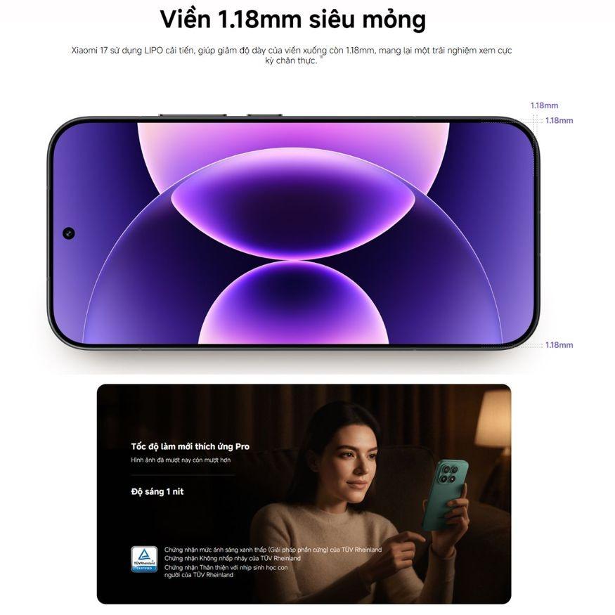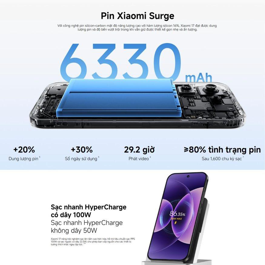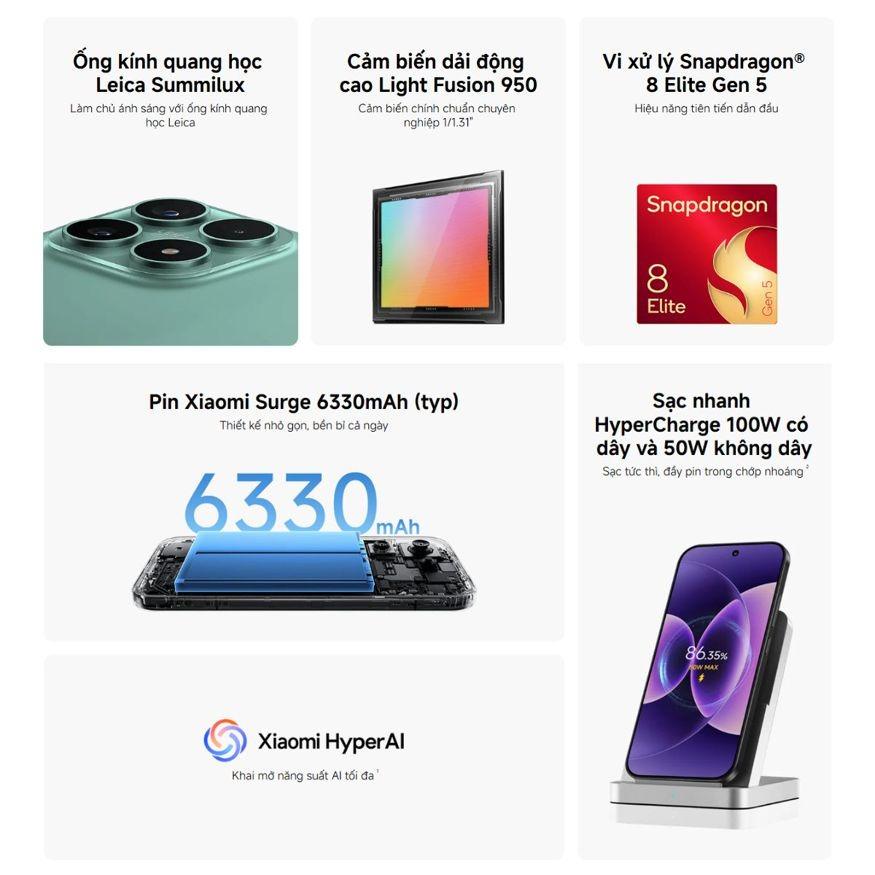 Xiaomi 17 tiếp tục khẳng định vị thế flagship nhỏ gọn khi sở hữu sức mạnh đột phá từ chip Snapdragon 8 Elite Gen 5, màn hình LTPO AMOLED 6.3 inch sắc nét. Điểm nhấn ấn tượng nhất chính là viên pin kỷ lục 6330mAh cho phép bạn sử dụng bền bỉ lên đến 2 ngày, đi kèm sạc nhanh 100W, nạp đầy pin trong khoảng 40 phút. Hệ thống camera Leica Summilux 50MP cùng công nghệ AI tiên tiến đảm bảo mọi bức ảnh chụp đêm đều giữ được độ chi tiết chuyên nghiệp và sống động. Bên cạnh đó, độ bền của máy cũng được nâng cấp với chuẩn kháng nước IP66/IP68/IP69, cho phép máy hoạt động trong nhiều điều kiện khắc nghiệt.
