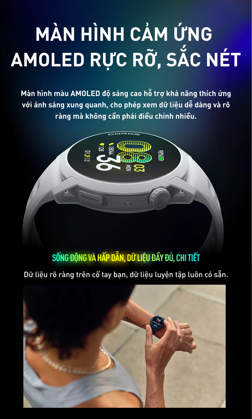 Màn hình AMOLED sắc nét: Cho phép đọc dữ liệu dễ dàng dưới ánh nắng mạnh hoặc trong điều kiện ánh sáng yếu.