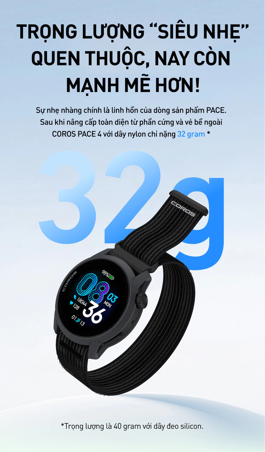 Thiết kế ultralight: Với trọng lượng chỉ 32g, PACE 4 rất phù hợp chạy bộ dài hoặc đeo cả ngày không cảm thấy nặng.