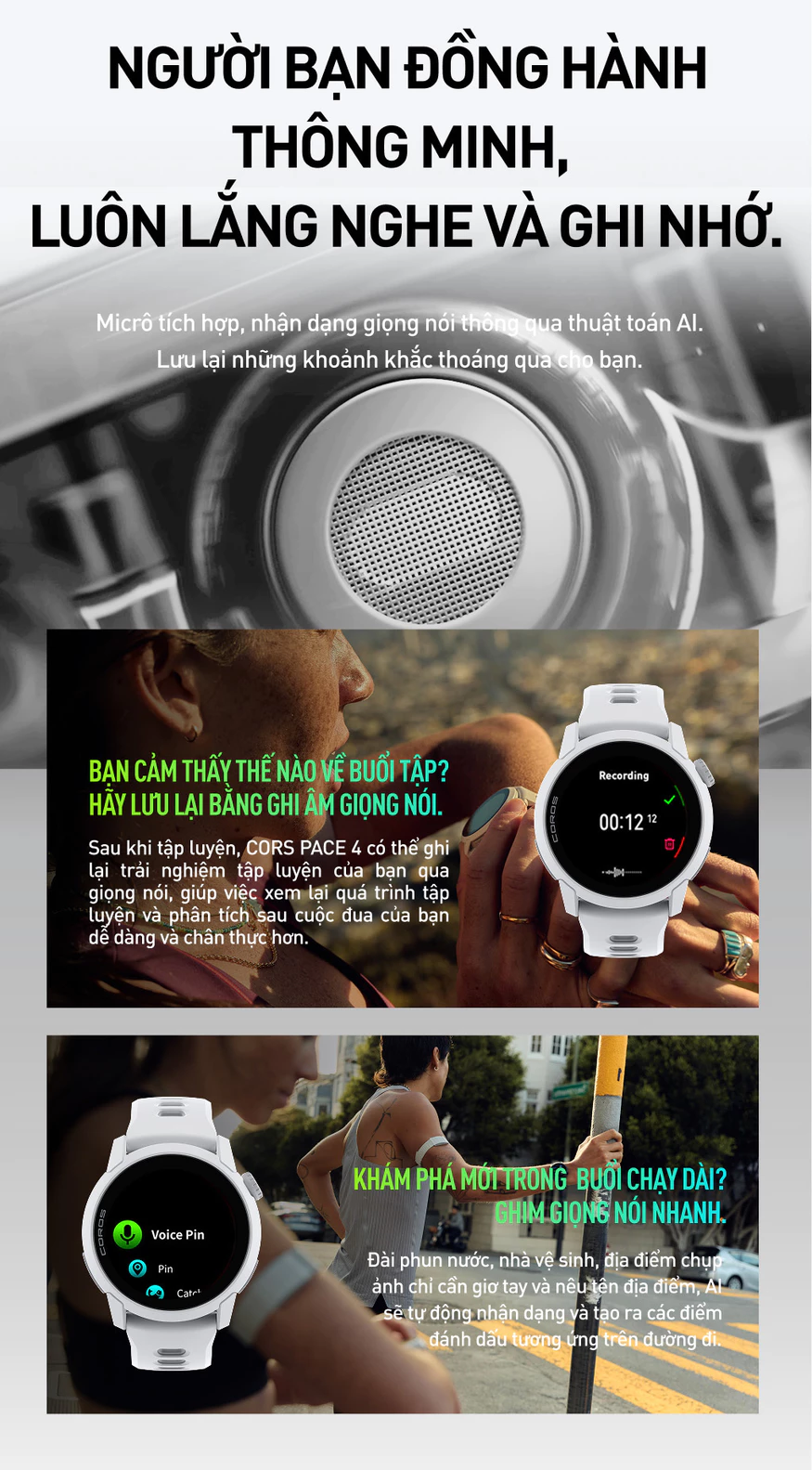 Ghi chú tập luyện bằng giọng nói (Voice Pins): Cho phép ghi nhanh cảm giác, lời nhắc hoặc thông tin bài tập khi đang chạy, lưu lại trong hồ sơ huấn luyện.