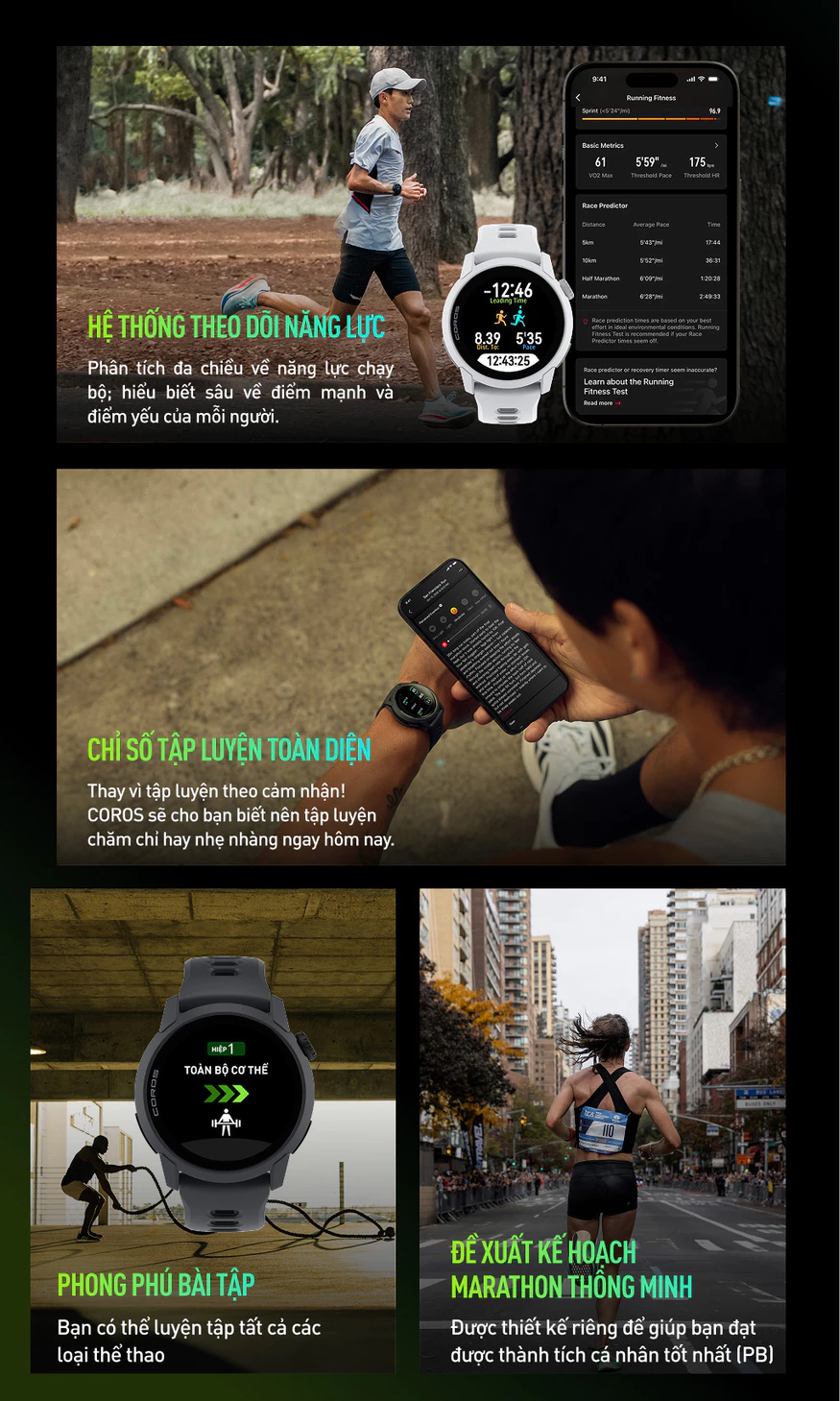 Công cụ huấn luyện nâng cao: Hỗ trợ Running Fitness, Race Predictor (dự đoán thành tích), Virtual Pacer, kế hoạch chạy marathon cá nhân.