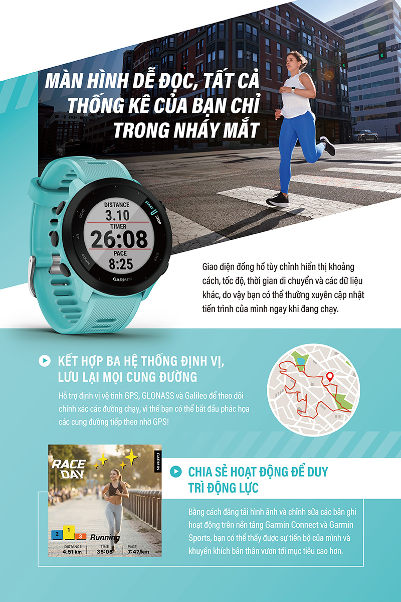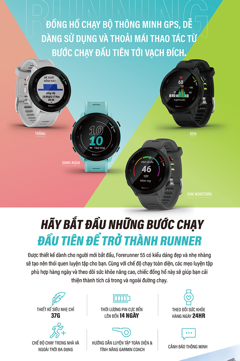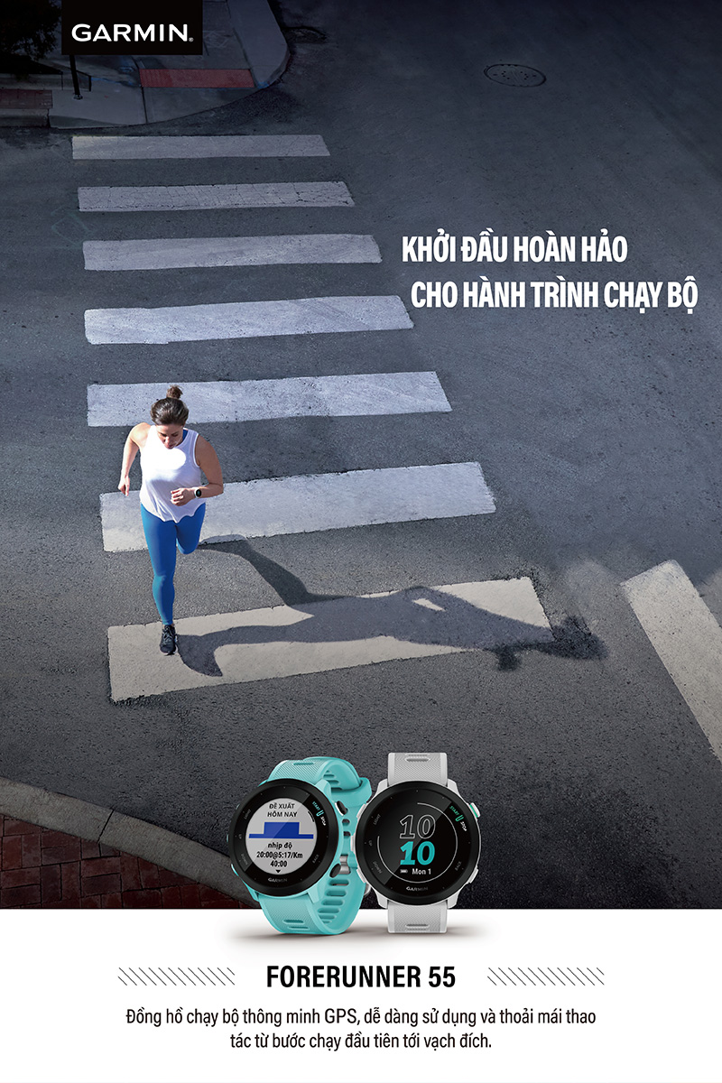 Đồng Hồ Thông Minh Garmin Forerunner 55 GPS (Black/Whitestone/Aqua/Monterra Grey) - Hàng Chính Hãng