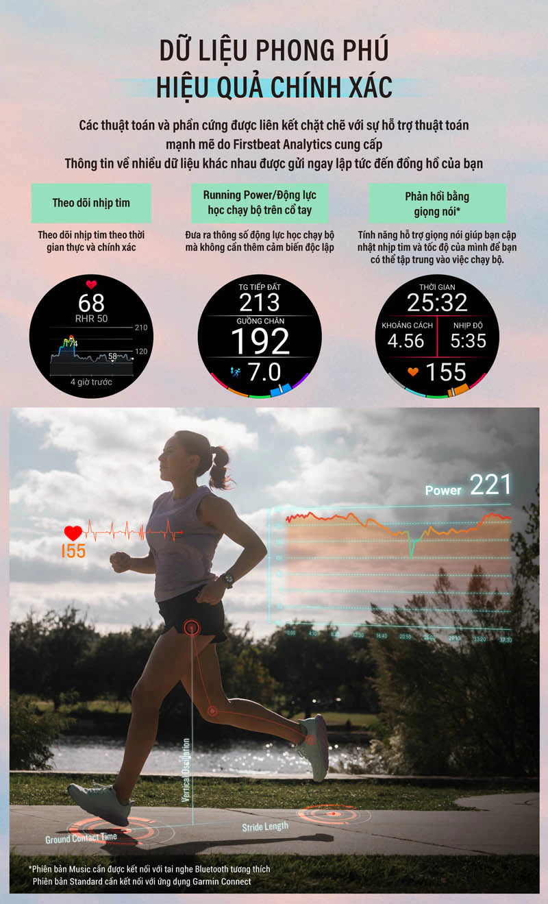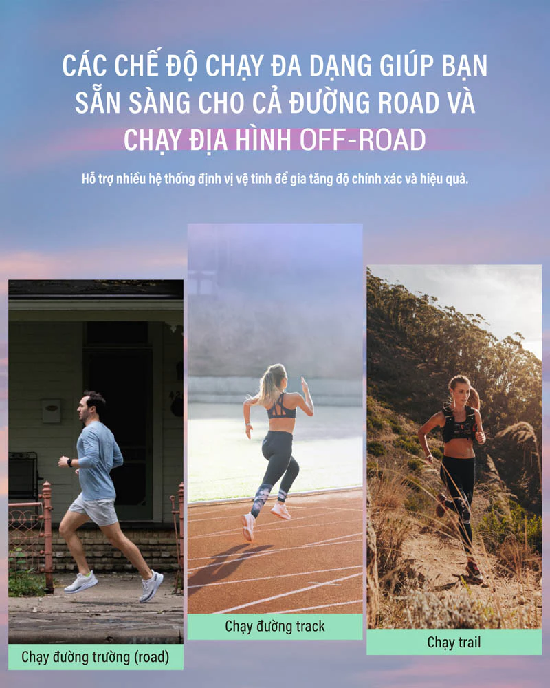 Theo dõi hiệu suất chạy của bạn trực tiếp từ cổ tay với các chỉ số như nhịp, tốc độ chân dài, thời gian tiếp đất, dao động dọc…