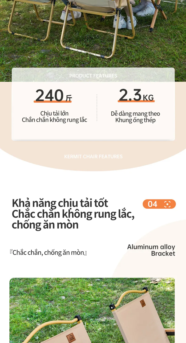 Ghế gấp ngoài trời nhẹ miễn lắp Khung đỡ lớn Tải trọng 190kg Ghế xếp Kermit