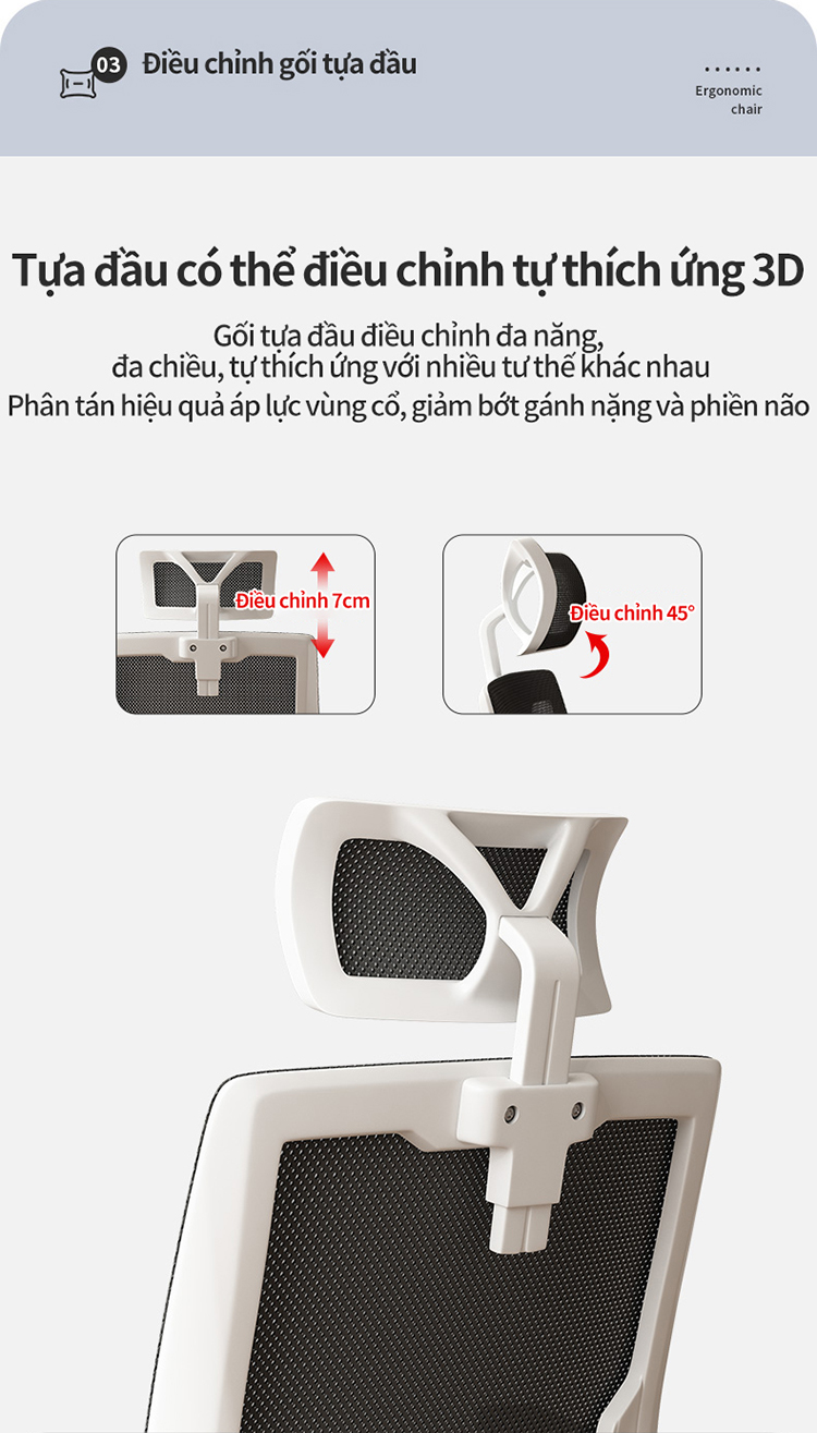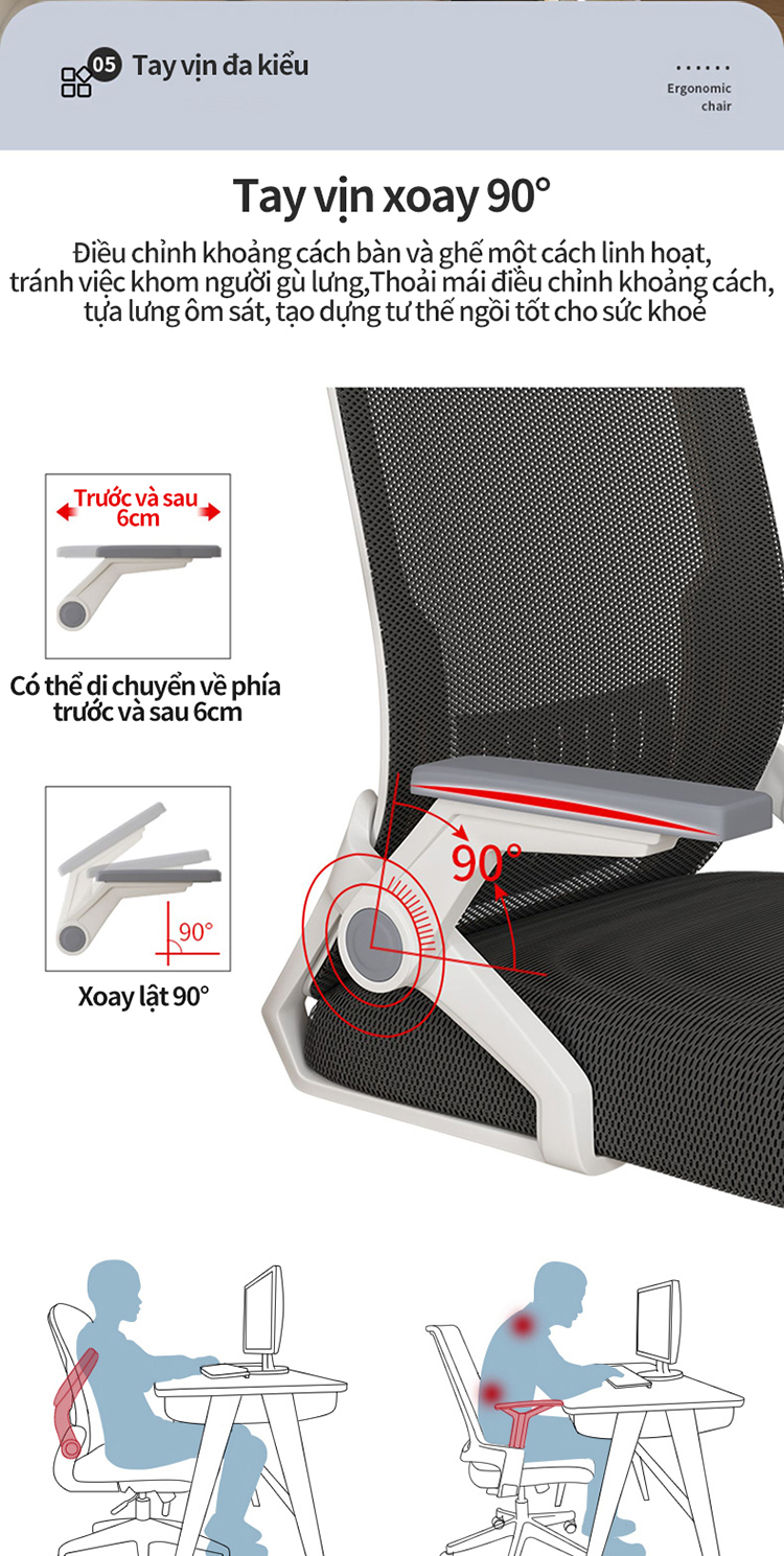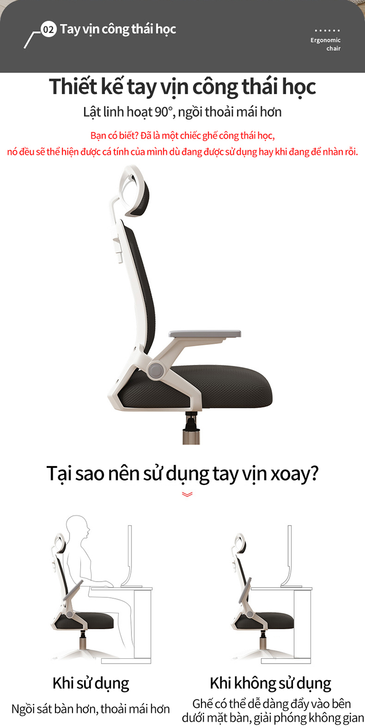 - Lưng kép, có gối tựa điều chỉnh độ cao chống mỏi, tay gập thông minh
