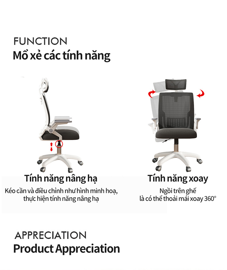 - Chất liệu: Chân và khung ghế nhựa ABS, vải lưới siêu thoáng khí, chân ghế chất liệu Thép cao cấp, siêu chắc chắn