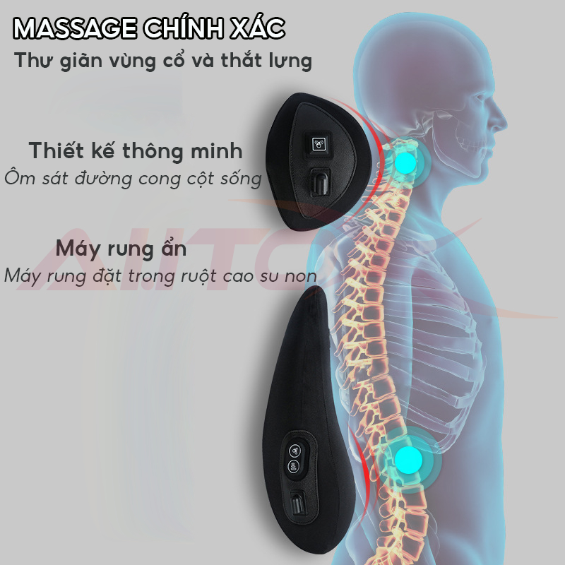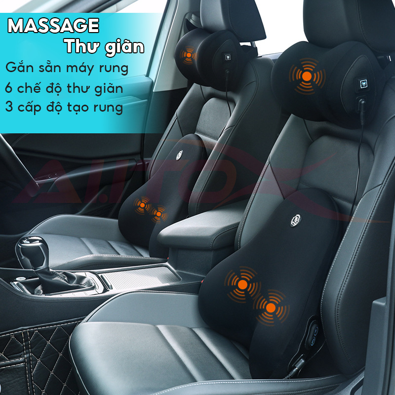 Gối đầu và tựa lưng ô tô massage -Thiết kế công thái học, 6 chế độ rung ruột cao su non êm ái - Giảm đau mỏi cổ vai gáy