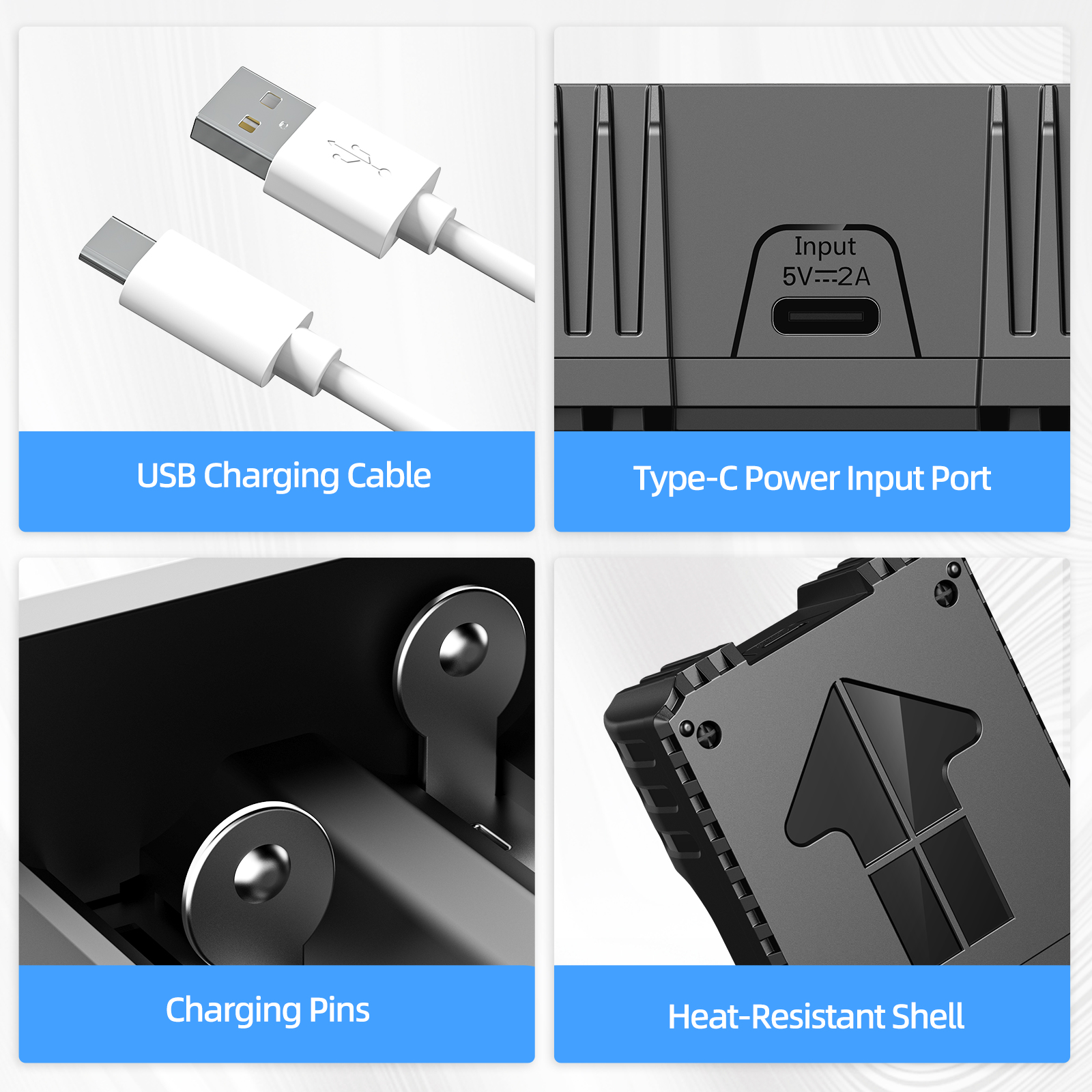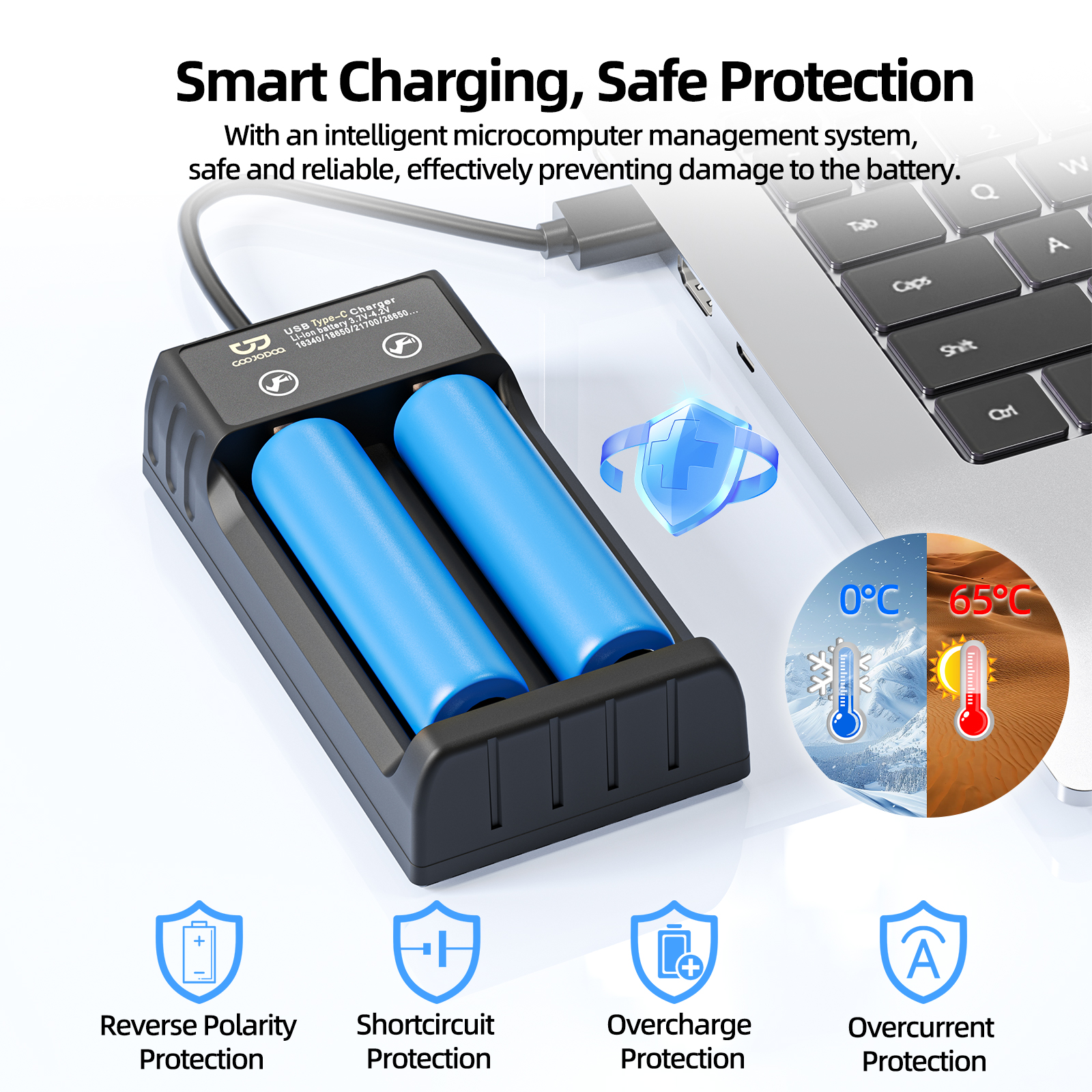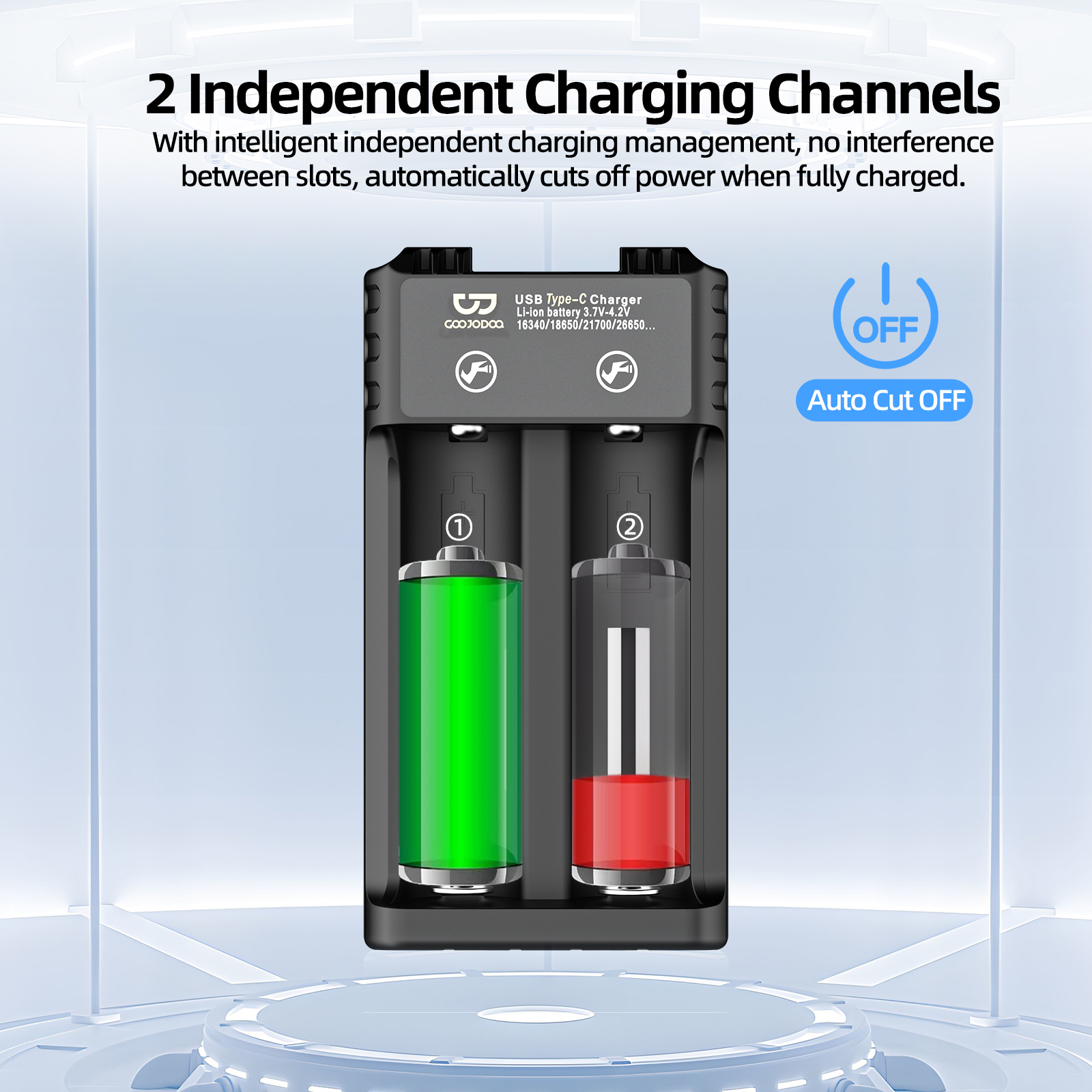 1. 2 Khe sạc độc lập: Bộ sạc pin lithium cung cấp 2 kênh để sạc 2 pin cùng lúc, cải thiện hiệu quả sạc và sự tiện lợi. Hơn nữa, quản lý sạc độc lập thông minh tích hợp cũng cung cấp khả năng sạc an toàn và đáng tin cậy, vì không có sự can thiệp giữa các khe cắm và tự động ngắt nguồn khi sạc đầy, bảo vệ hiệu quả pin khỏi bị hư hỏng do kết nối ngược, đoản mạch, sạc quá mức và quá dòng.