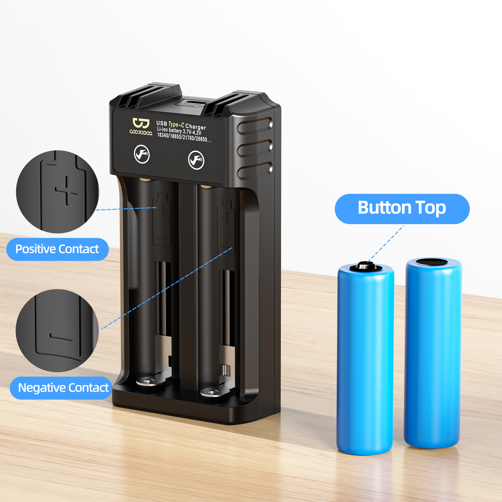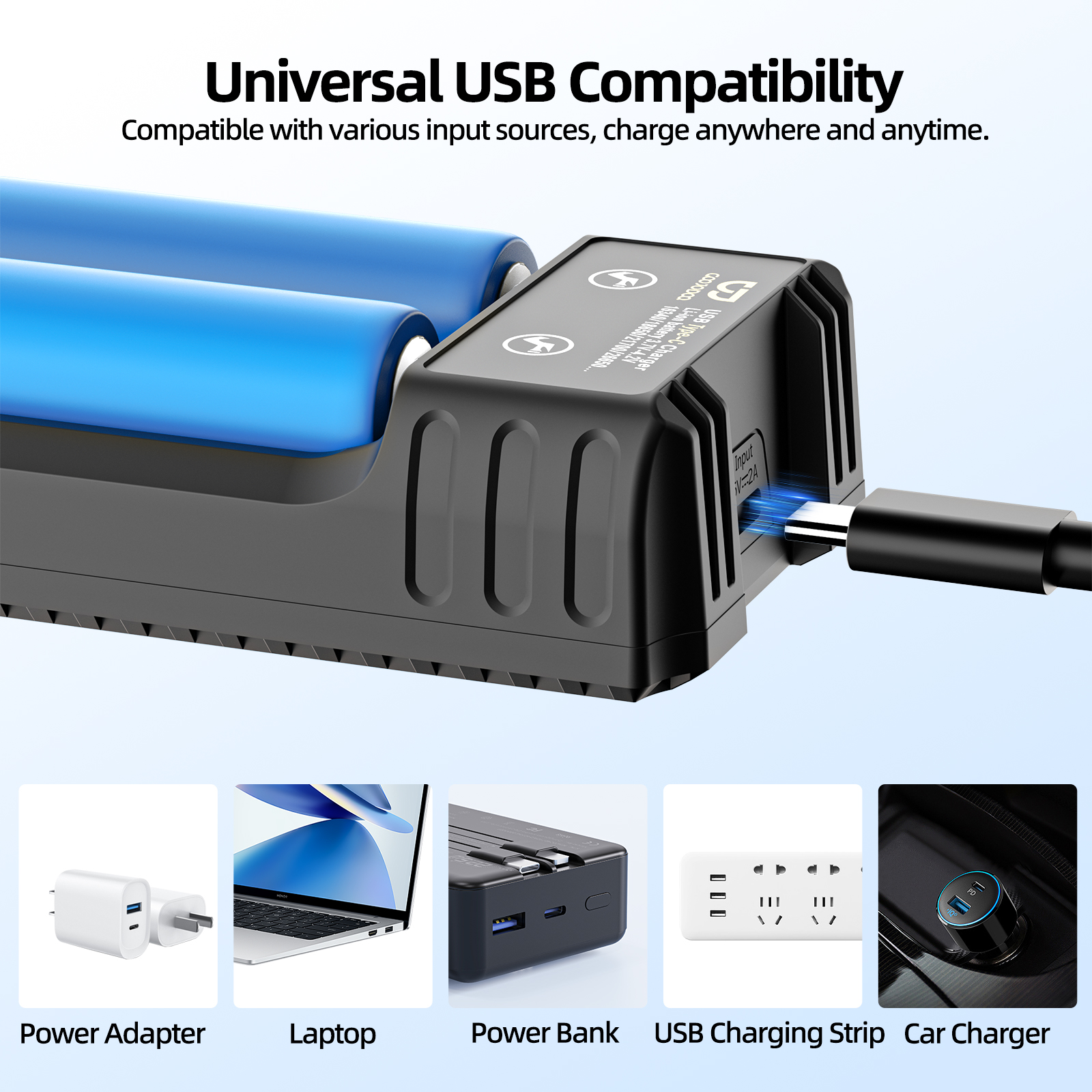 3. "Khe sạc có thể điều chỉnh, Khả năng tương thích rộng: Các chân sạc có thể điều chỉnh và có thể kéo dài tới 75mm, dễ dàng chứa các loại pin có độ dài và kích thước khác nhau, tương thích với hầu hết các loại pin sạc Li-ion / IMR / INR 3,6V / 3,7V, chẳng hạn như 26700, 26650, 26500, 25500, 22700, 21700, 20700, 22650, 22500, 18700, 18650, 18500, 18490, 18350, 17650, 16650, 14650, 14500, 10400, 16340 (RCR123), v.v.