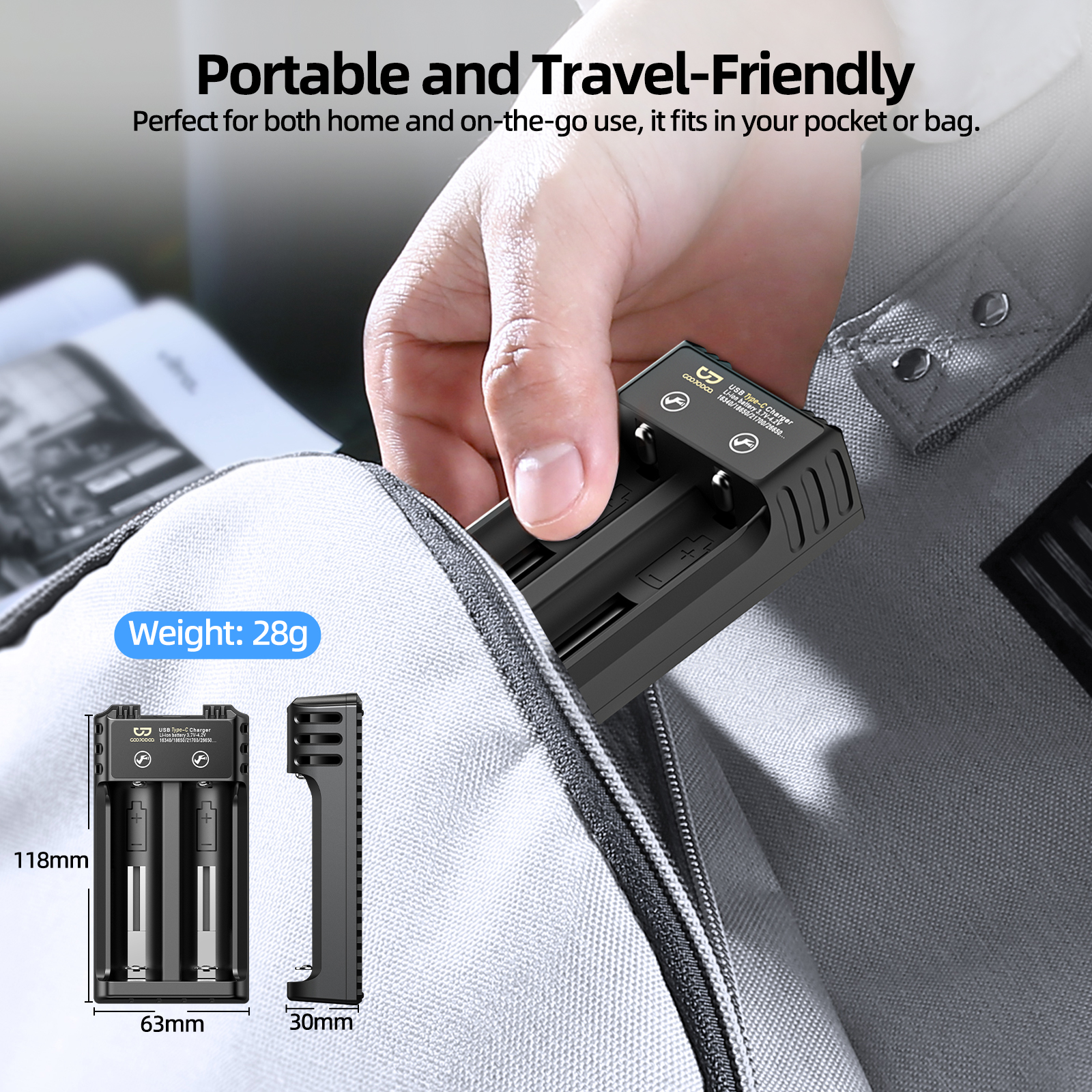 5. "Bộ sạc pin di động: Với kích thước 118x63x30mm và chỉ nặng 28g, bộ sạc nhỏ gọn và nhẹ dễ dàng bỏ vào túi hoặc ba lô của bạn và không gây thêm gánh nặng khi mang theo, khiến nó trở nên hoàn hảo cho cả sử dụng tại nhà và khi đi du lịch.