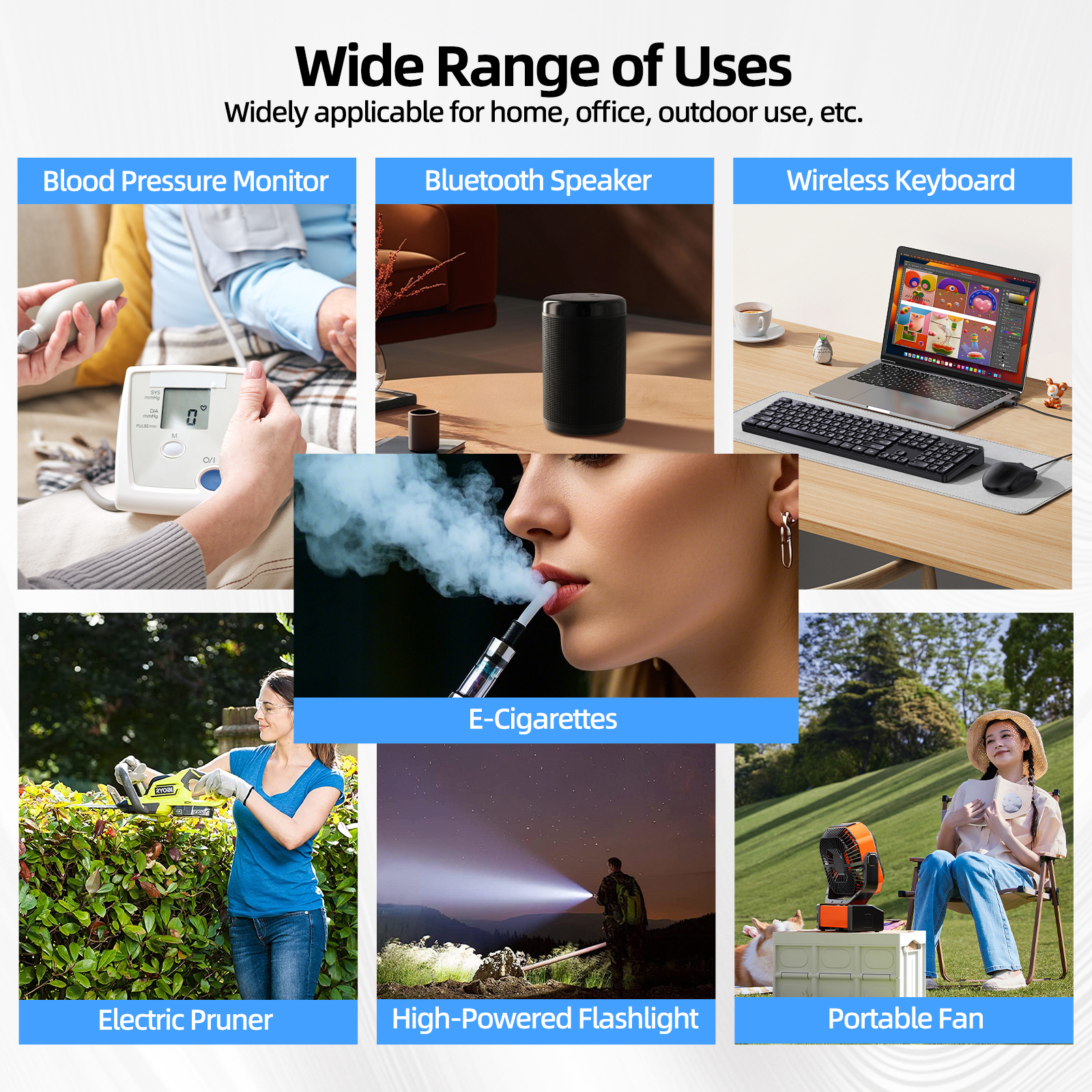 Ứng dụng đa năng: Nhờ khả năng tương thích với pin rộng, tiện lợi khi sạc và tính di động tuyệt vời, nó lý tưởng cho các thiết bị gia đình như máy đo huyết áp và điều khiển từ xa TV, thiết bị văn phòng như bàn phím không dây và máy ghi âm, thiết bị ngoài trời và thể thao như đèn pin và đèn pha công suất cao để đi bộ đường dài, thuốc lá điện tử, thiết bị di động như loa Bluetooth và quạt cầm tay, dụng cụ điện như máy khoan điện và máy cắt tỉa, thiết bị chụp ảnh và hình ảnh như gimbal chống rung và đèn chiếu sáng, thiết bị ô tô và an ninh như camera hành trình và máy dò khói, v.v."