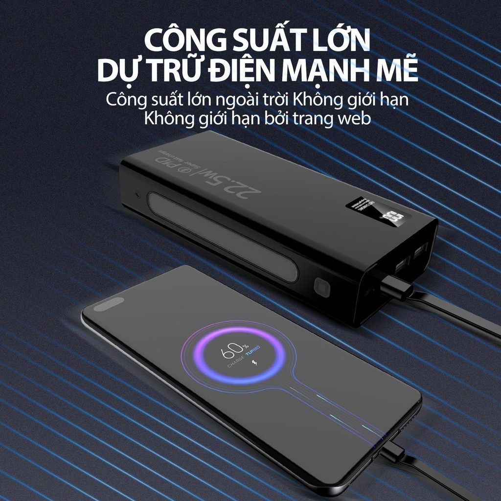 Sạc nhanh PD 22,5W: Cổng USB hỗ trợ tối đa PD 22,5W, cổng Loại C hỗ trợ tối đa PD 20W và đầu nối Loại C hỗ trợ tối đa 22,5W. Ngân hàng điện di động có thể sạc đầy các thiết bị trong vòng 1,5 giờ, cải thiện hiệu quả sạc lên gấp đôi.