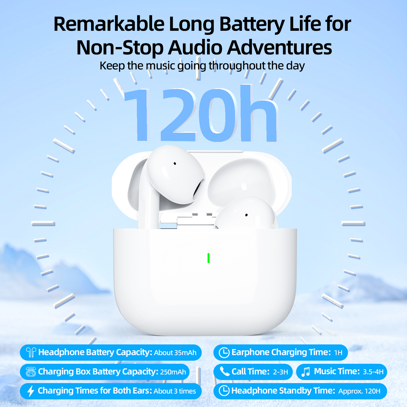 Thời lượng pin dài: Tai nghe Bluetooth có pin 35mAh trong mỗi tai nghe và hộp sạc 250mAh mạnh mẽ. Mỗi tai nghe cung cấp thời gian chơi nhạc kéo dài từ 3,5 đến 4 giờ và hộp sạc cung cấp thời gian chờ lâu lên đến 120 giờ, không cần sạc thường xuyên, nâng cao trải nghiệm người dùng của bạn.