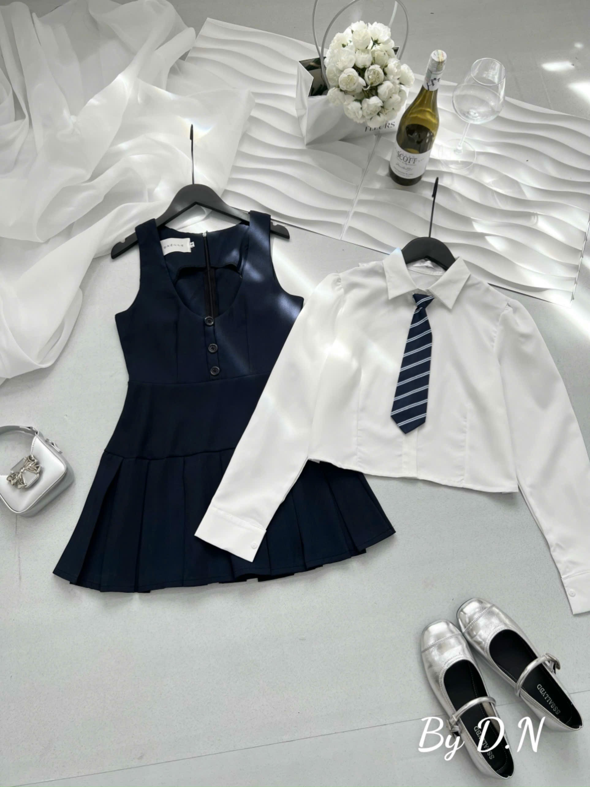 (Hàng Sẵn): Set Yếm Tuyết Đuôi Xếp Ly Mix Áo Sơ Mi Thô Tay Bồng Dài Tay Kèm Cà Vạt Chuẩn Form Mẫu Mặc Lollaye