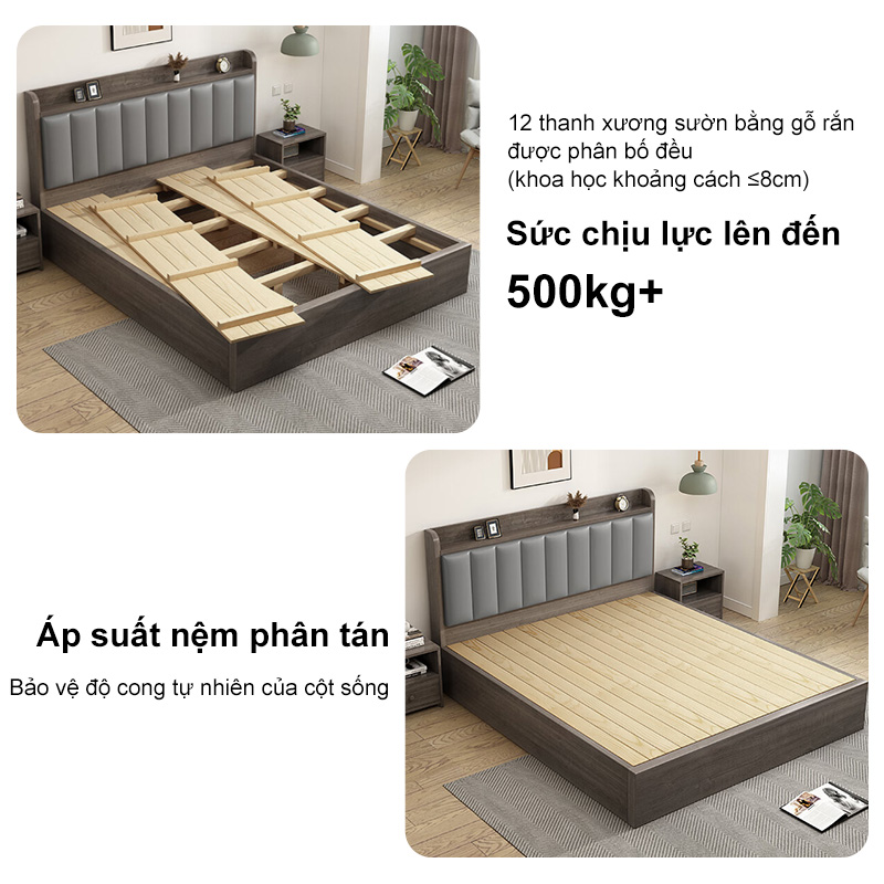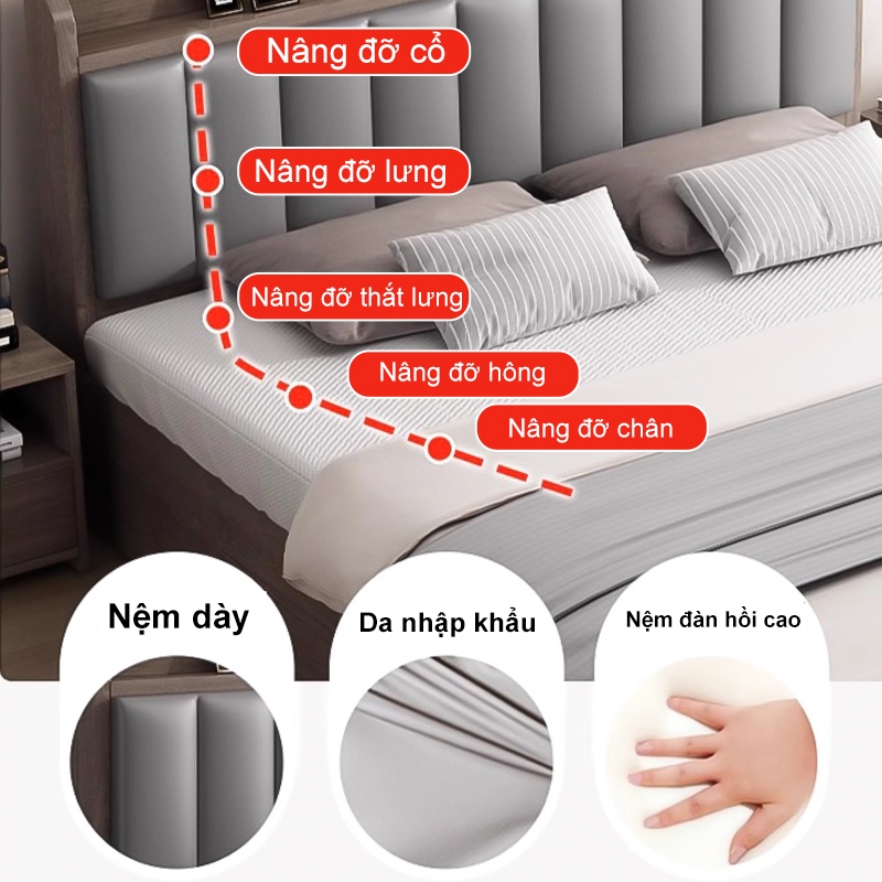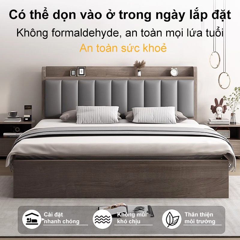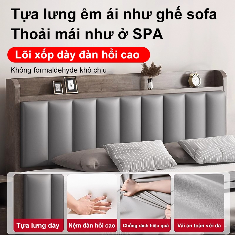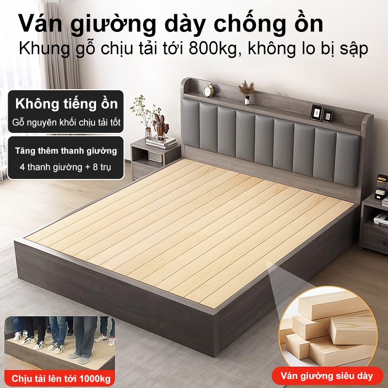 HEINO Giường Ngủ Gỗ 1m6x2m Tự Nhiên Bền Đẹp Đầu Giường Túi Mềm Đệm Tựa Có Ngăn Chứa Đồ Hiện Đại