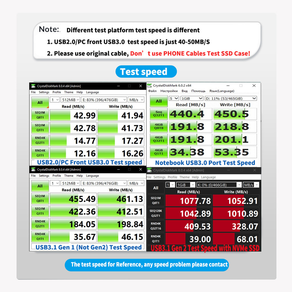 Tốc độ truyền bị giới hạn bởi bốn khía cạnh sau: tốc độ truyền của chính đĩa cứng, tốc độ truyền của hộp đĩa cứng, tốc độ truyền của cáp dữ liệu và tốc độ truyền của kết nối Thiết bị. (Ví dụ: vỏ đĩa cứng 10Gbps được kết nối với giao diện máy tính chỉ hỗ trợ 5Gbps, sau đó nó chỉ có thể đạt tốc độ 5Gbps.) Vì vậy, nếu bạn cảm thấy tốc độ quá chậm, vui lòng thay đĩa cứng hoặc khung máy hoặc cáp dữ liệu hoặc máy tính và thử luân phiên.