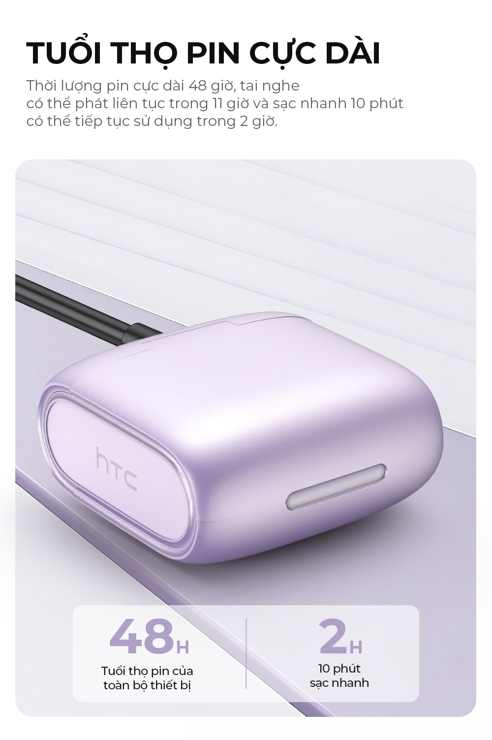 Tai nghe có thời lượng pin duy nhất là 6 giờ và có thể sạc đầy thêm 3 lần bằng hộp sạc, với tổng thời lượng pin là 24 giờ, cho phép bạn xem chương trình truyền hình và nghe nhạc liên tục!