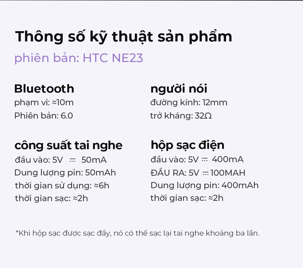 Tai nghe có thể sạc đầy trong 2 giờ và hộp sạc có thể sạc đầy trong 2 giờ. Hỗ trợ dòng điện đầu ra cao 100mA, giúp sạc nhanh hơn và an toàn hơn.