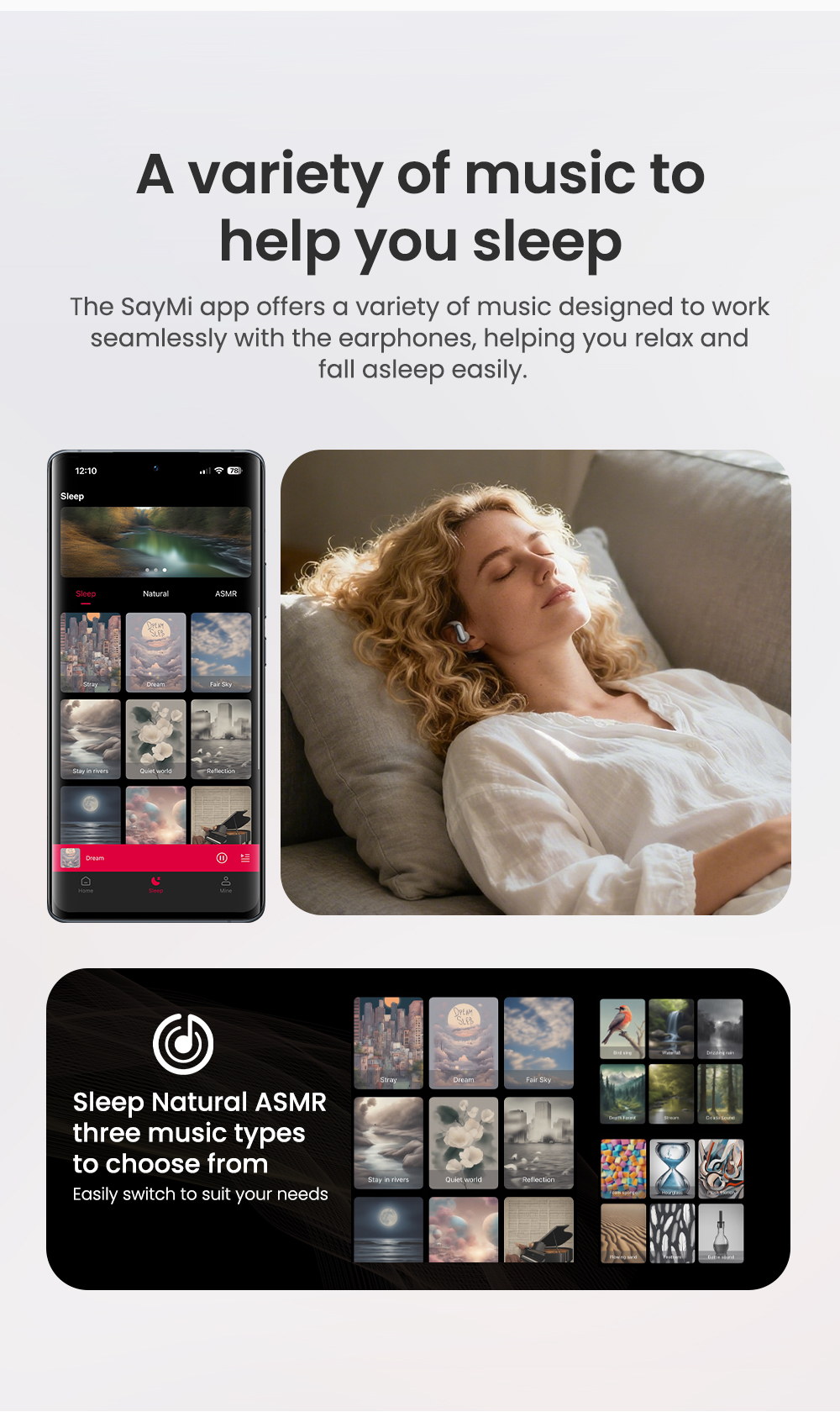 Hỗ trợ nhạc ngủ:** Nghe ASMR/âm thanh tự nhiên khi ngủ thông qua ứng dụng SayMi để dễ dàng thư giãn và chìm vào giấc ngủ.
