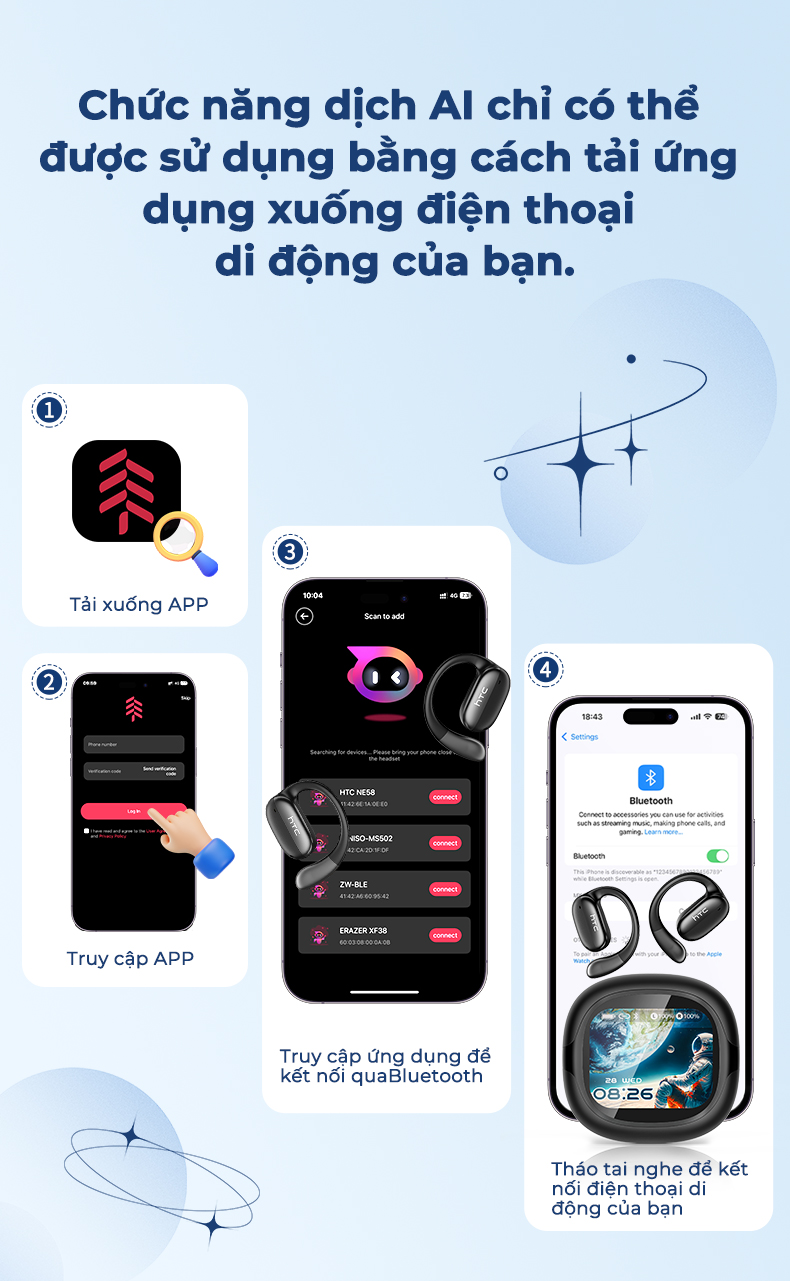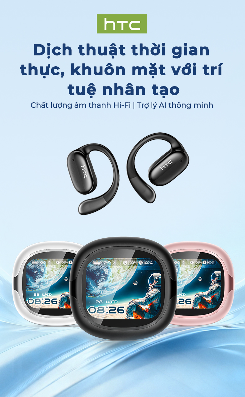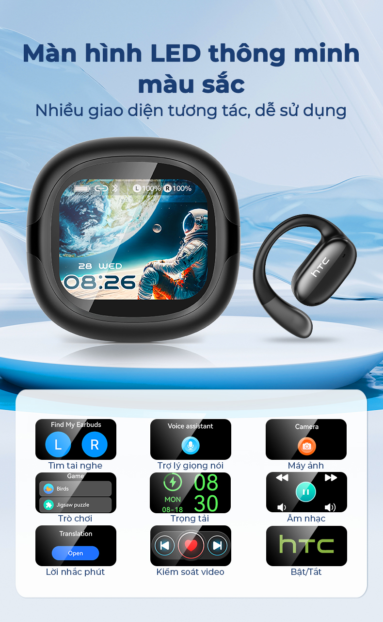 HTC NE58 AI Translator Tai nghe Bluetooth 6.0 HiFi Sound Tai nghe mở tai có màn hình cảm ứng