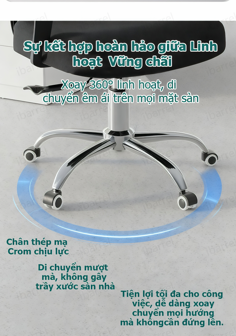 Bánh xe tĩnh âm: Di chuyển 360 độ mượt mà, không gây tiếng ồn hay làm trầy xước sàn nhà.