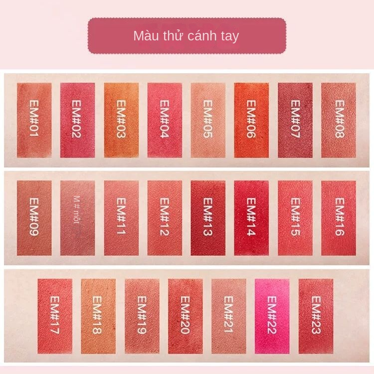 Màu sắc '#Em01 Trà Đỏ Cam quýt,#Em02 màu hồng ,#Em03 Nâu trà Caramel,#Em04 Màu đỏ Berry đậm ,#Em05 Trà Mơ Nhẹ,#Em06 Cà chua rang,#Em07 Đậu đỏ đậm,#Em08 Hematite,#Em09 Ô long quế,#Em10 Mocha hun khói,#Em11 Hoa Hồng Hơi Say *#Em12 Kẹo Dâu tây,#Cà phê sữa Em13 Lê đỏ,#Em14 Iceberry Đỏ,#Bột đào ngọt Em15,#Hoa hồng muối biển Em16,#Em17 Quả táo gai đào ,#Cát hoàng hôn Em18,#Em19 Cát mật ong đỏ thịnh soạn,#Em20 Cha Cha Thạch táo tàu,#Em21 Quế Punk,#Chợ hoa hồng tím Em22,#Em23 Đậu mận đỏ,#Em525 Gửi Chunye,#C1 Đào sữa muối,#Hoa mẫu đơn san hô C2,#C3 Hoa hồng mận,#W2 Cà chua,#W3 Đậu trộn trái đào