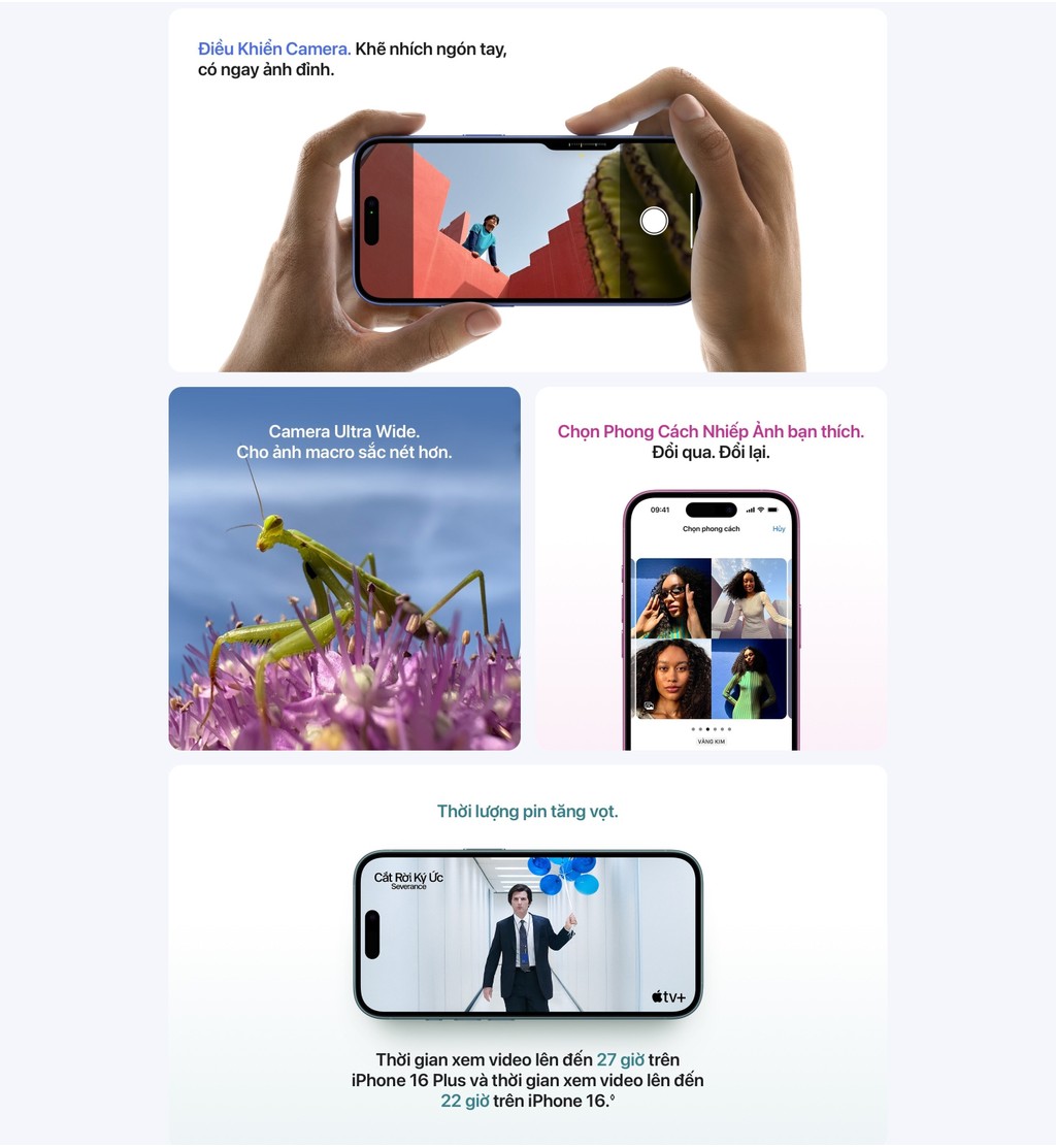 - THỜI LƯỢNG PIN DÀI HƠN – iPhone 16 kết hợp cùng chip A18 cho thời lượng pin tăng vọt với thời gian xem video lên đến 22 giờ. Sạc qua USB-C hoặc gắn vào bộ sạc MagSafe để sạc không dây nhanh hơn.