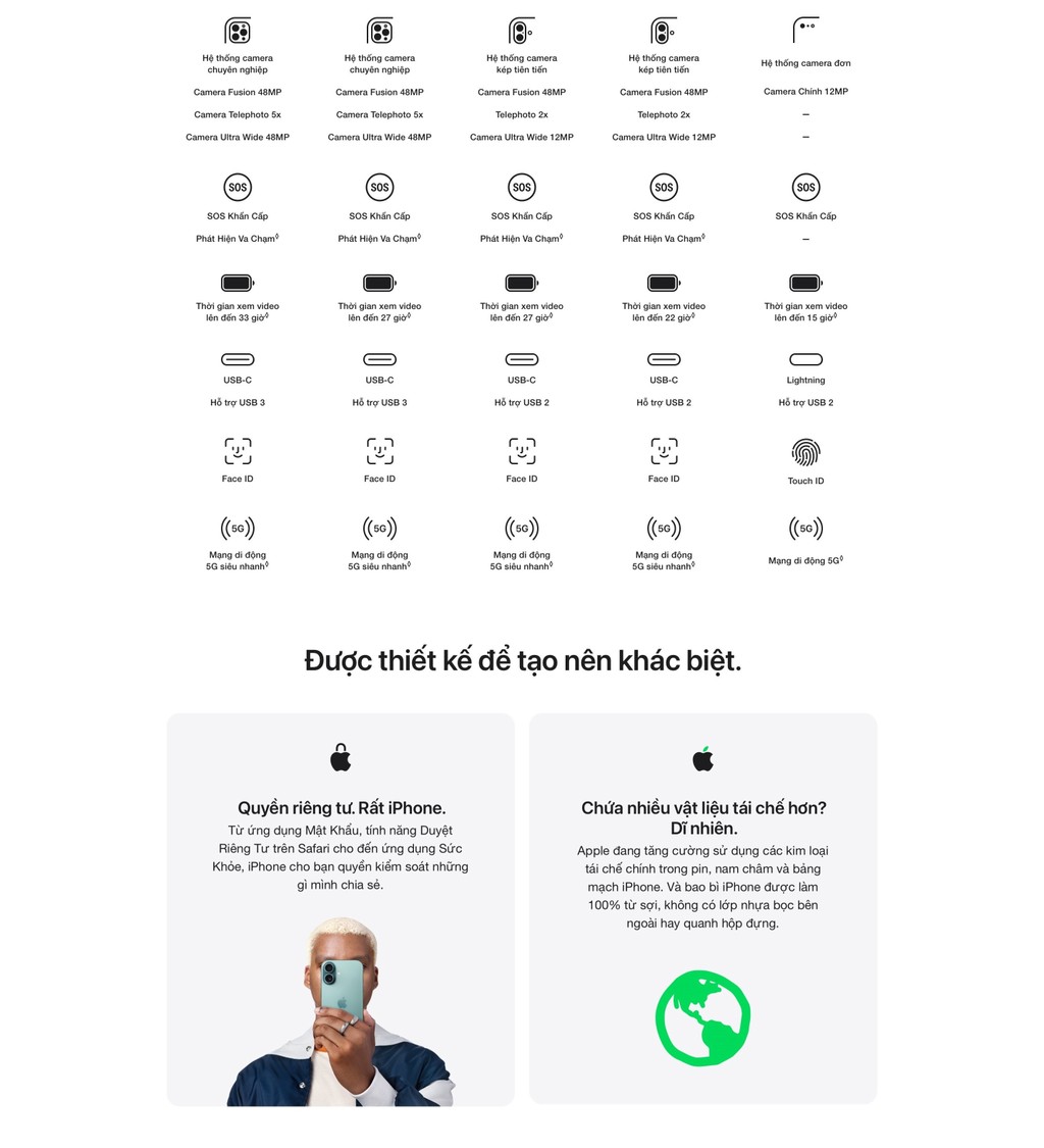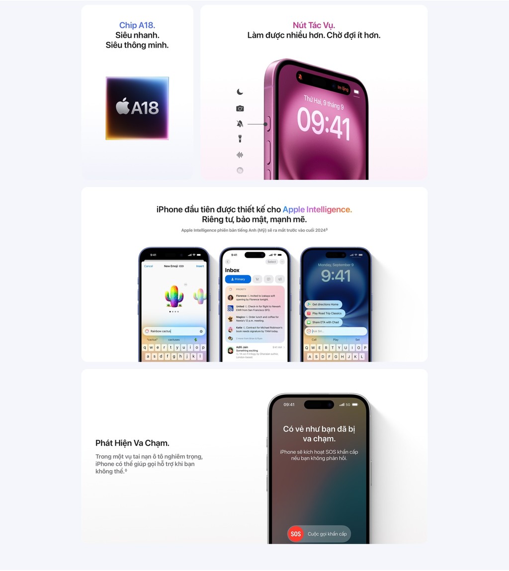 - CHIP A18 SIÊU THÔNG MINH – A18 tiến xa hơn hai thế hệ so với chip A16 Bionic trên iPhone 15. Chip hỗ trợ các tính năng chụp ảnh, quay video tiên tiến và chơi game y như trên máy console với hiệu quả tiết kiệm điện vượt trội.