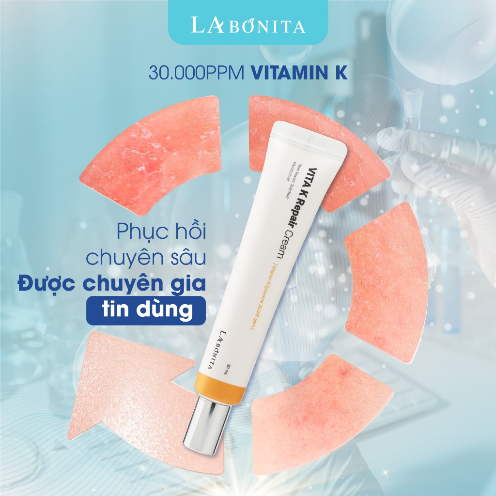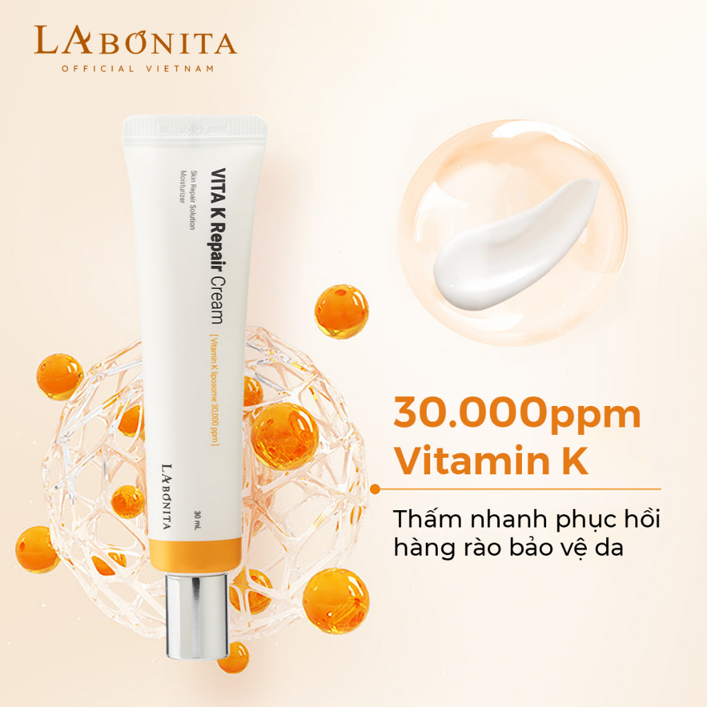 Kem Dưỡng Phục Hồi Da La Bonita Vita K Repair Cream 30ml mang đến khả năng phục hồi da vượt trội, làm lành nhanh các tổn thương trên da do giãn mao mạch, thâm đỏ, bầm tím, sau peel da, sau laser, sau xâm lấn và tiểu phẫu nhờ sức mạnh của Vitamin K.