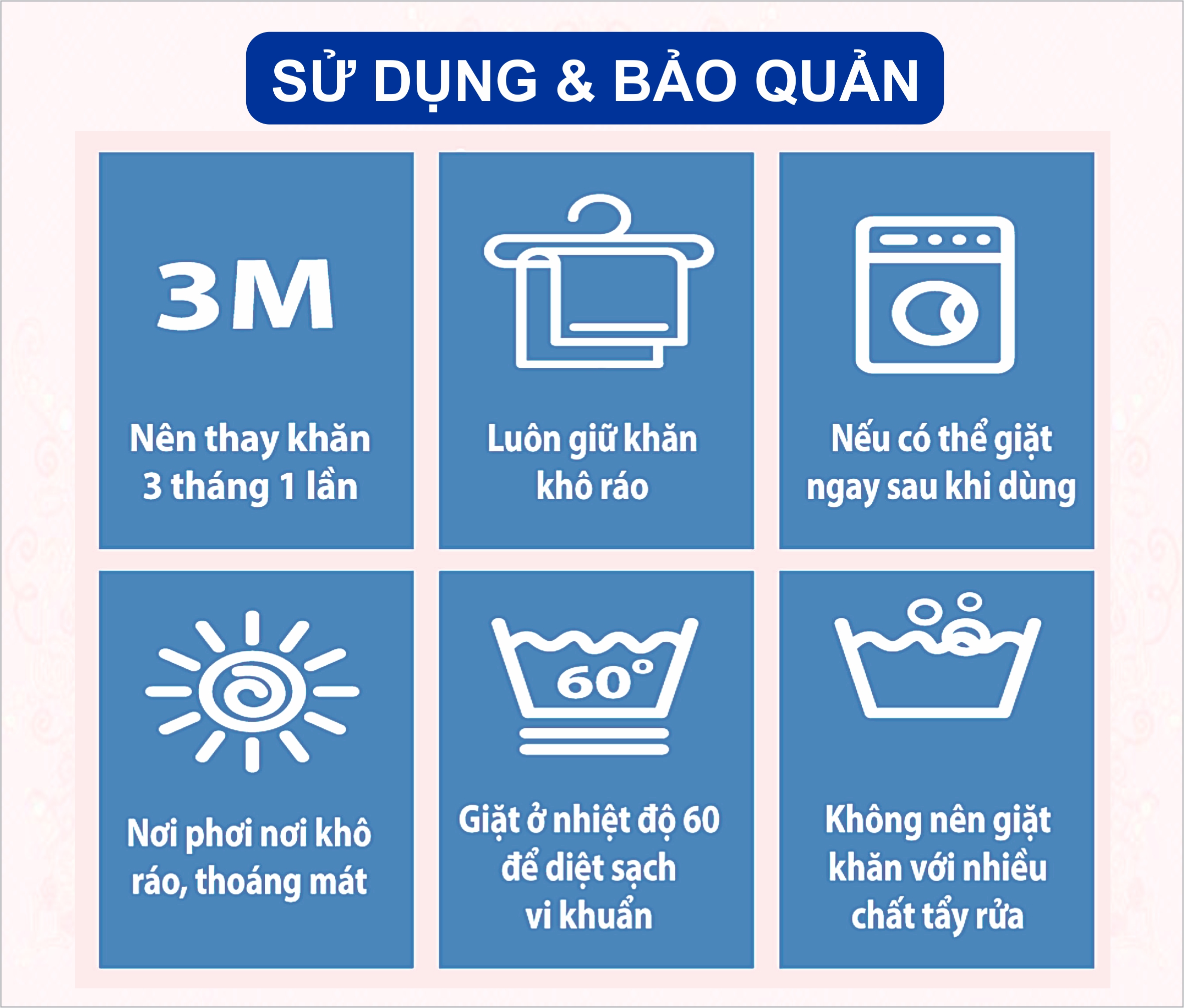 - Sử dụng xong nên phơi ở nơi khô ráo thoáng mát để khăn không bị mùi ẩm mốc, tránh nơi nắng gắt.