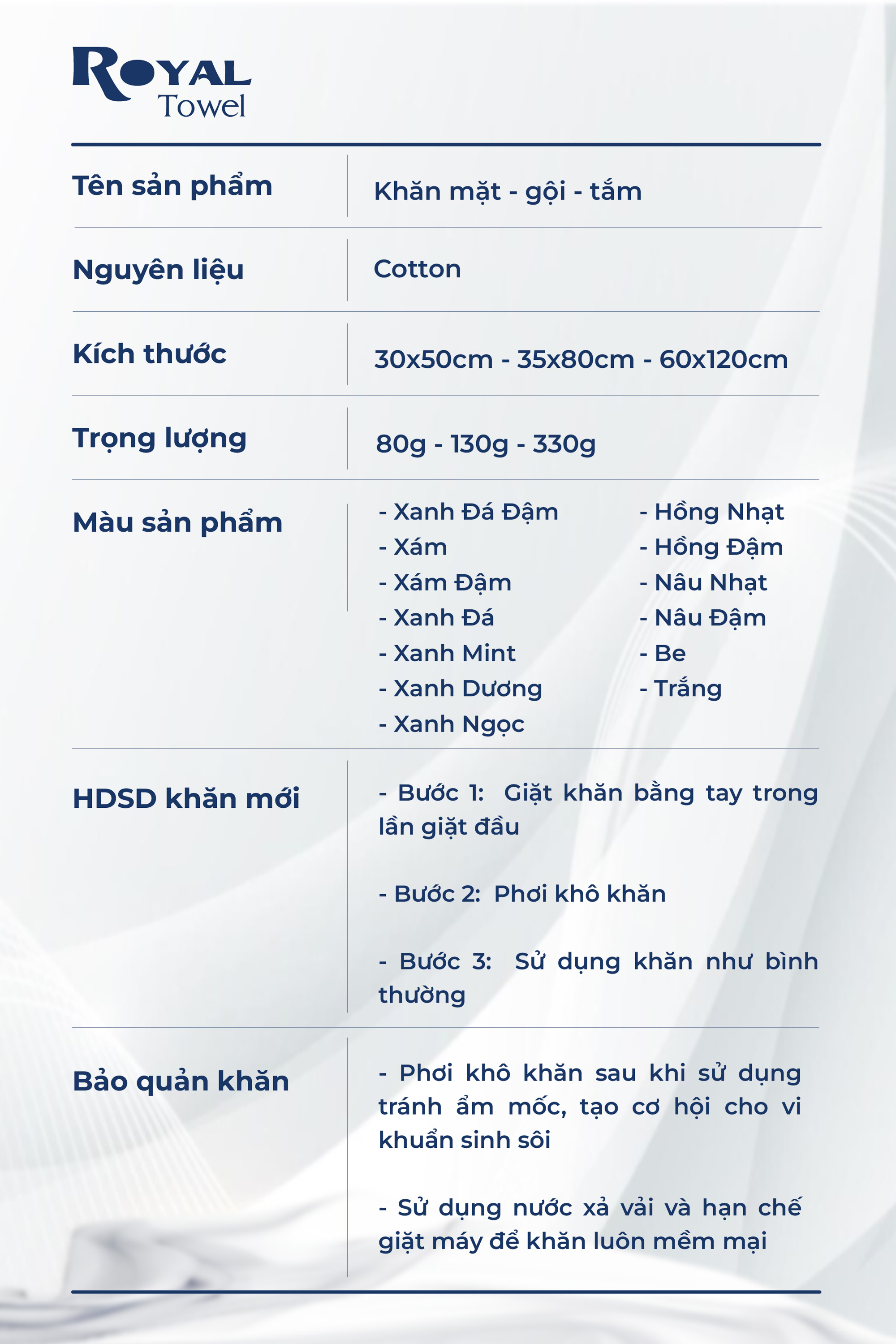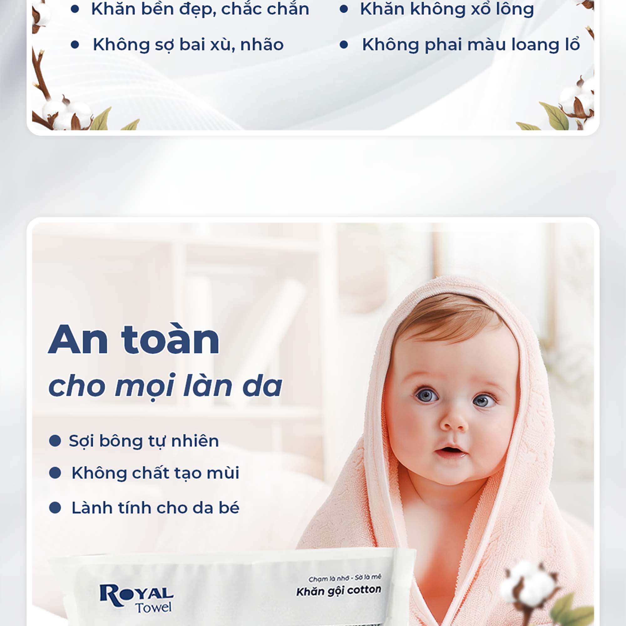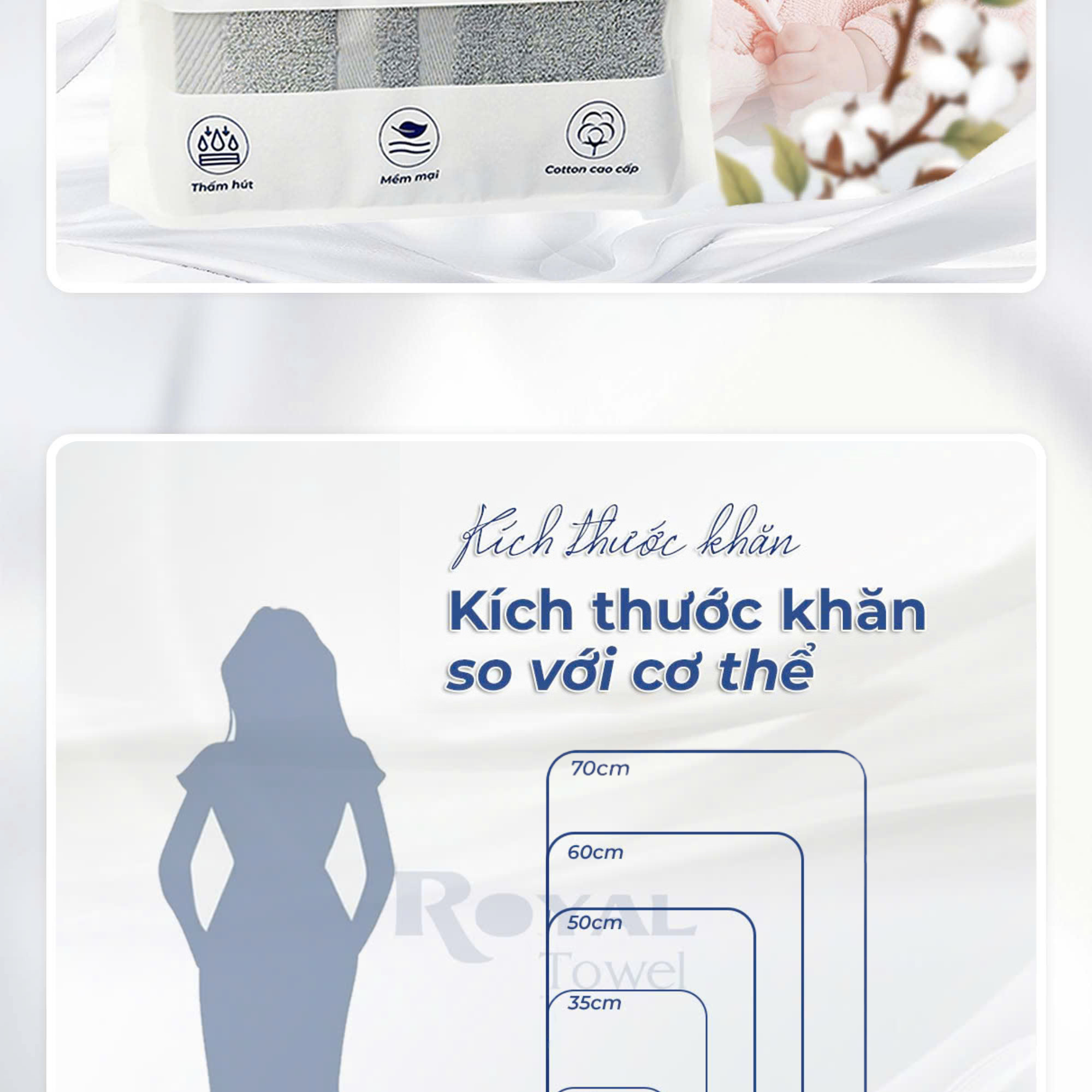 Khăn Tắm, Gội Đầu, Lau Mặt ROYAL TOWEL 100% Cotton Mềm Mại, Thấm Hút, Kháng Khuẩn