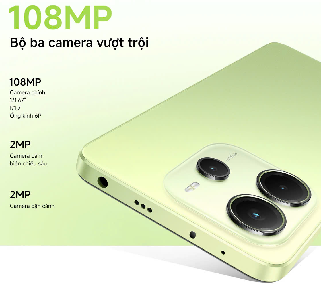 - Điện thoại Xiaomi Redmi Note 14 128GB sở hữu camera chính với độ phân giải 108MP với khẩu độ f/1.7 và cảm biến lớn 1/1.67 inch, cho phép chụp ảnh với độ chi tiết tuyệt vời. Bên cạnh đó, camera này còn được trang bị công nghệ AI, chống rung quang học (OIS) và lấy nét theo pha (PDAF). Từ đó, giúp tối ưu hóa ánh sáng và màu sắc, tạo ra những bức ảnh sống động và chân thực trong nhiều điều kiện ánh sáng khác nhau.