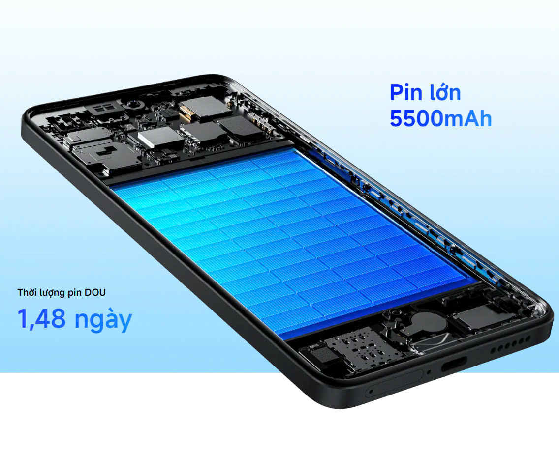 - Xiaomi Redmi Note 14 128GB sở hữu viên pin lên đến 5500mAh, cho phép sử dụng cả ngày dài. Với dung lượng này, bạn có thể vô tư thưởng thức phim ảnh, chơi game hay thực hiện các công việc khác mà không phải lo lắng về việc hết pin. Máy có thể hoạt động liên tục tới hai ngày với những tác vụ thông thường.