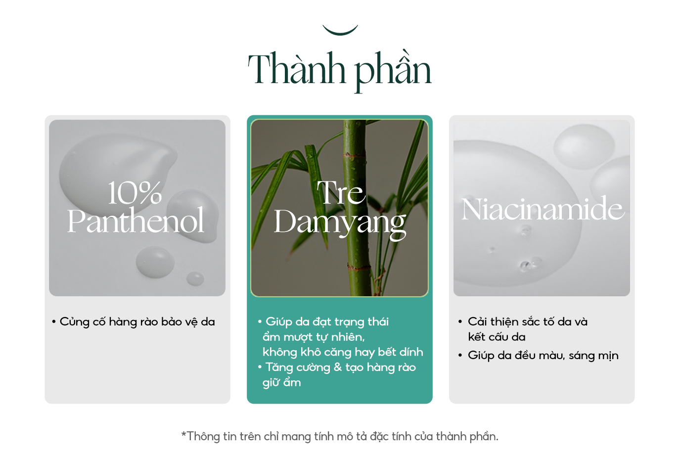 - Chiết xuất tre Damyang – bổ sung khoáng chất, giữ ẩm và bảo vệ da trước tác động môi trường.